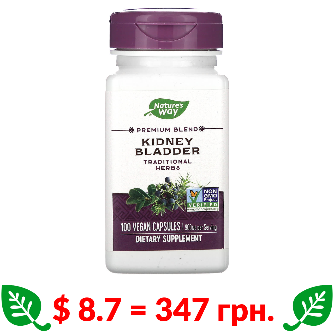 $ 8.7 = 347 грн. ????️ у кошику ????️ Nature’s Way, добавка для нирок і сечового міхура, 900 мг, 100 веганських капсул (450 мг у капсулі)