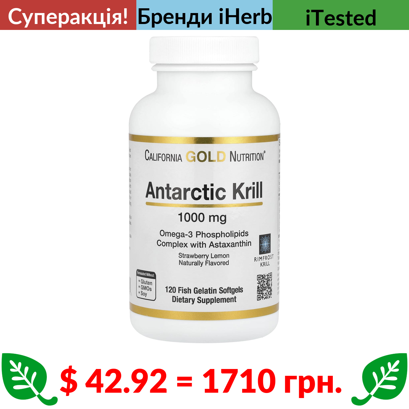 $ 42.92 = 1710 грн. ???? cуперакція! ???? California Gold Nutrition, жир антарктичного криля, комплекс фосфоліпідів омега-3 з астаксантином, з натуральним смаком полуниці та лимона, 1000 мг, 120 капсул із риб’ячого желатину