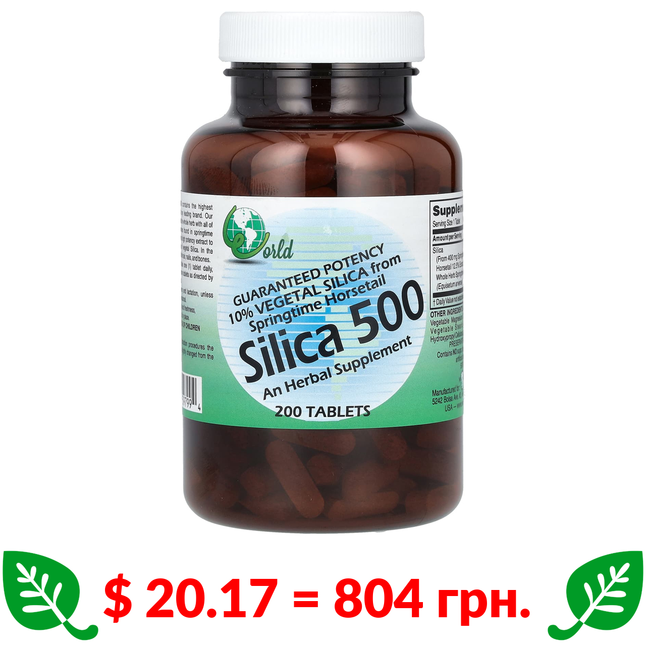 $ 20.17 = 804 грн. World Organic, Silica 500, діоксид кремнію, 200 таблеток