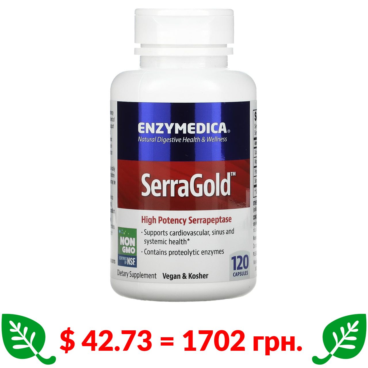 $ 42.73 = 1702 грн. Enzymedica, SerraGold, високоефективна серрапептаза, 120 капсул