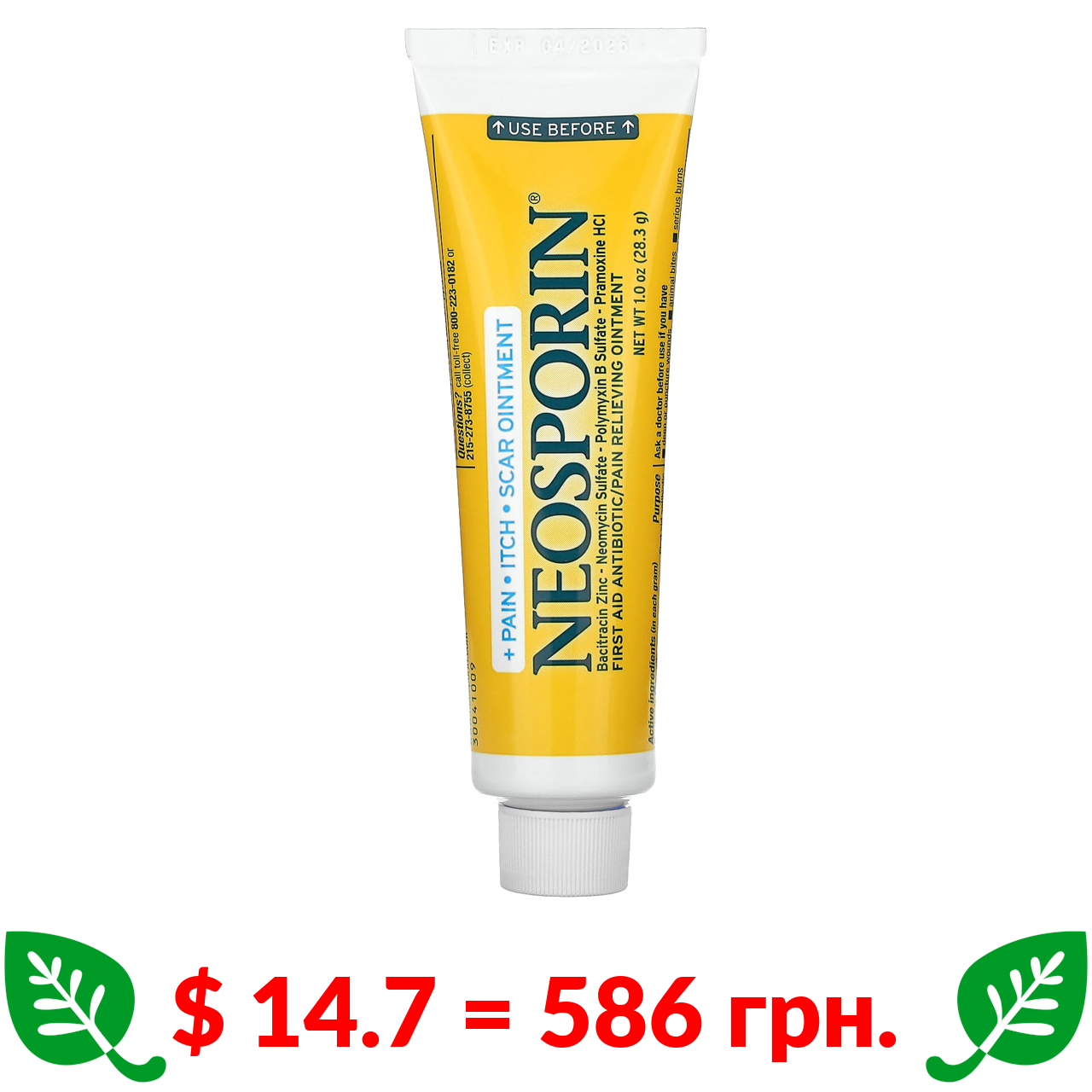 $ 14.7 = 586 грн. Neosporin, мазь проти болю, свербежу та шрамів, 28,3 г (1 унція)