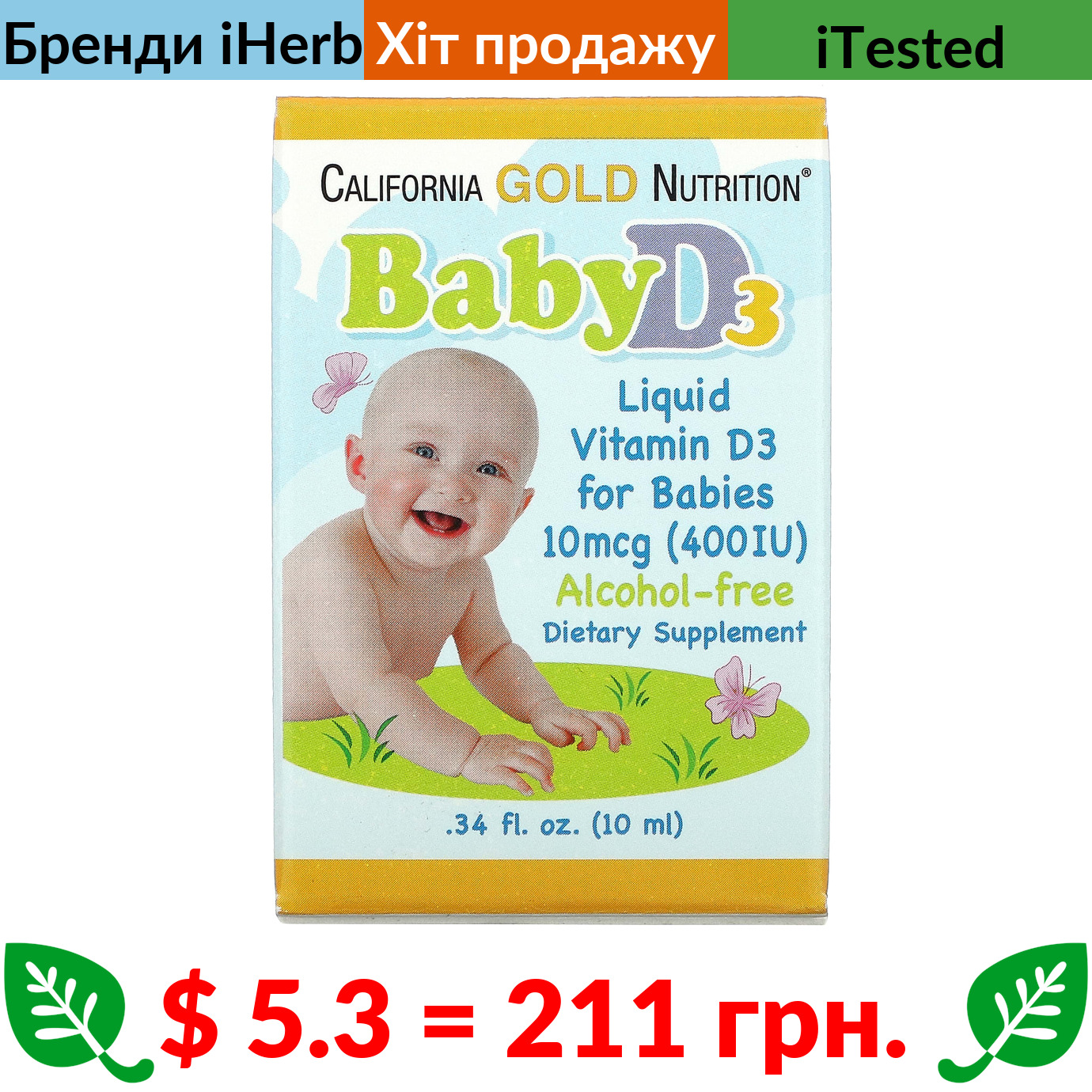 $ 5.3 = 211 грн. California Gold Nutrition, вітамін D3 у рідкій формі для дітей, 10 мкг (400 МО), 10 мл (0,34 рідк. унції)