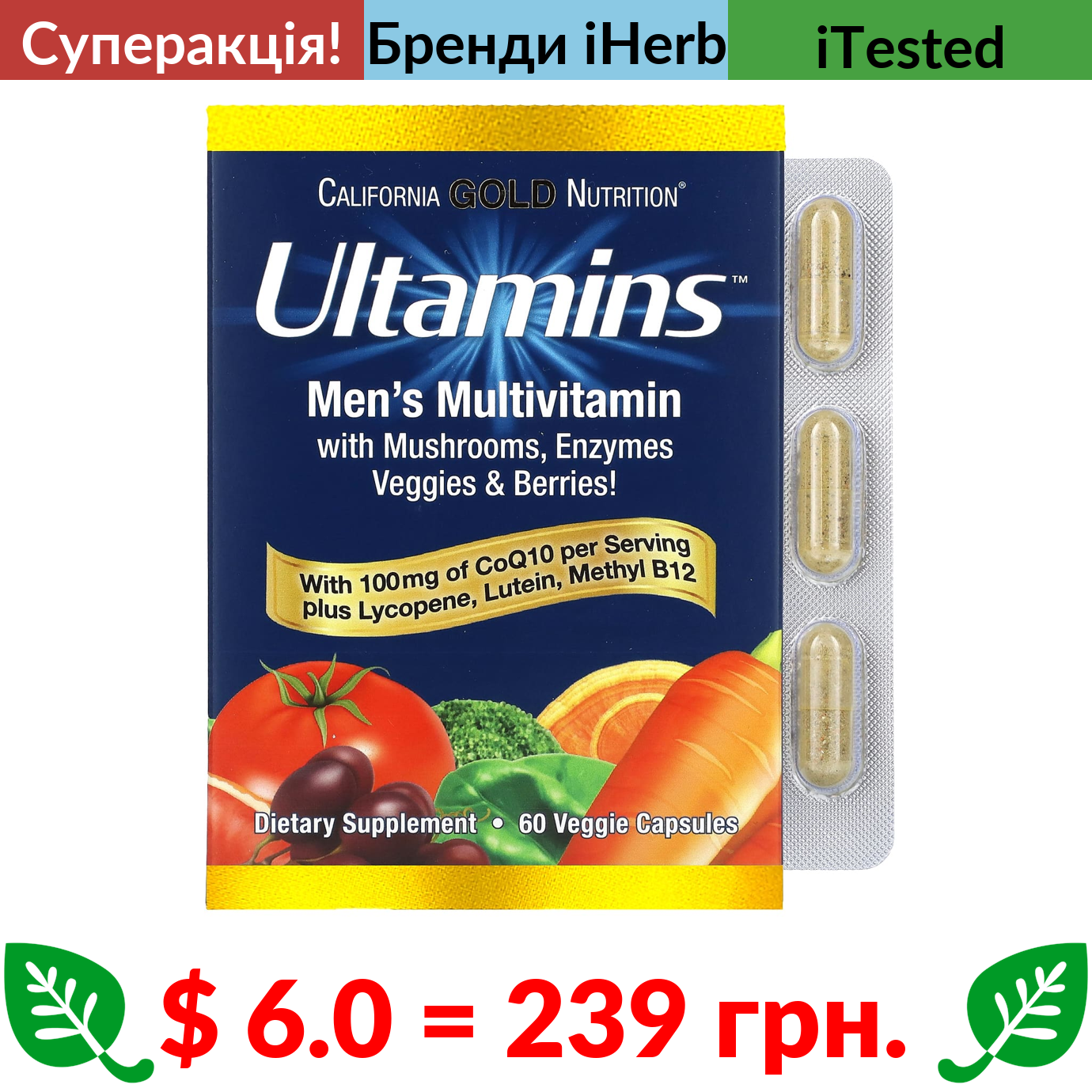 $ 6.0 = 239 грн. ???? cуперакція! ???? California Gold Nutrition, Ultamins, мультивітаміни для чоловіків із коензимом Q10, гриби, ферменти, овочі та ягоди, 60 вегетаріанських капсул