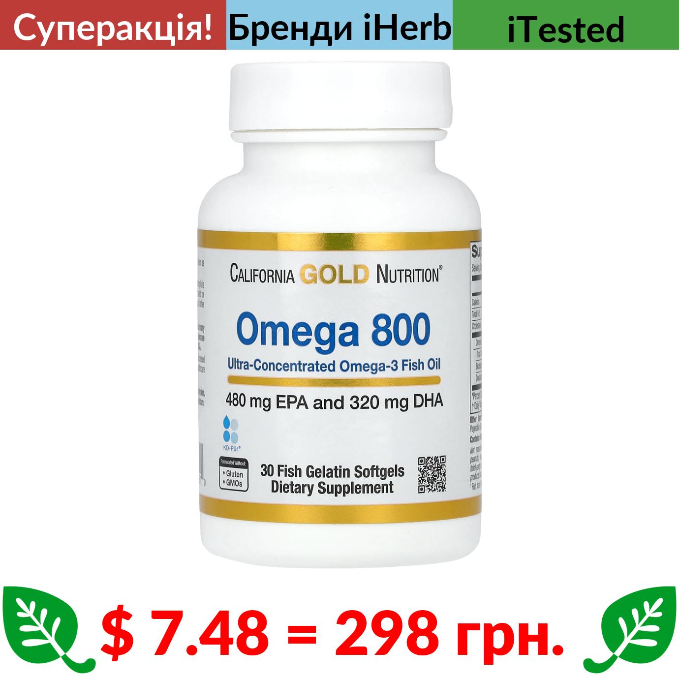 $ 7.48 = 298 грн. ???? cуперакція! ???? California Gold Nutrition, омега-800, ультраконцентрований риб’ячий жир із омега-3, у формі тригліцеридів kd-pur, 1000 мг, 30 капсул із риб’ячого желатину