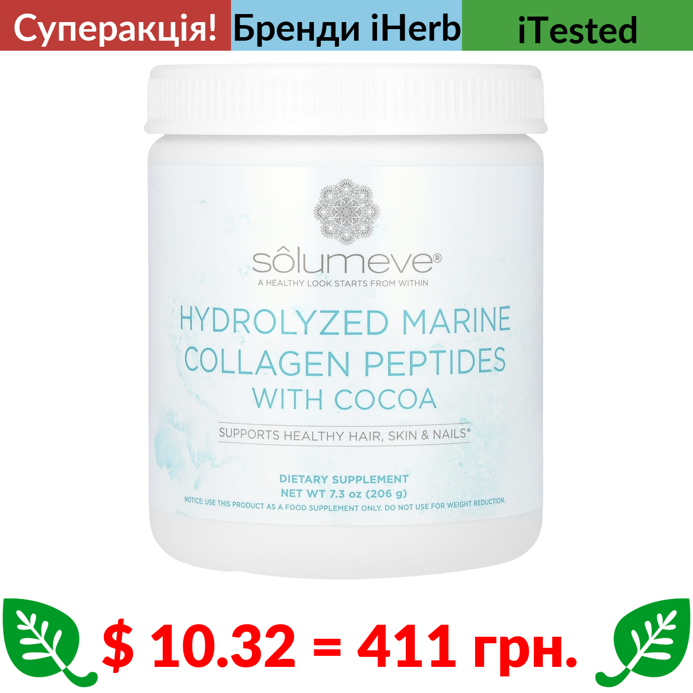 $ 10.32 = 411 грн. ???? cуперакція! ???? Solumeve, пептиди гідролізованого морського колагену з какао, 206 г (7,3 унції)