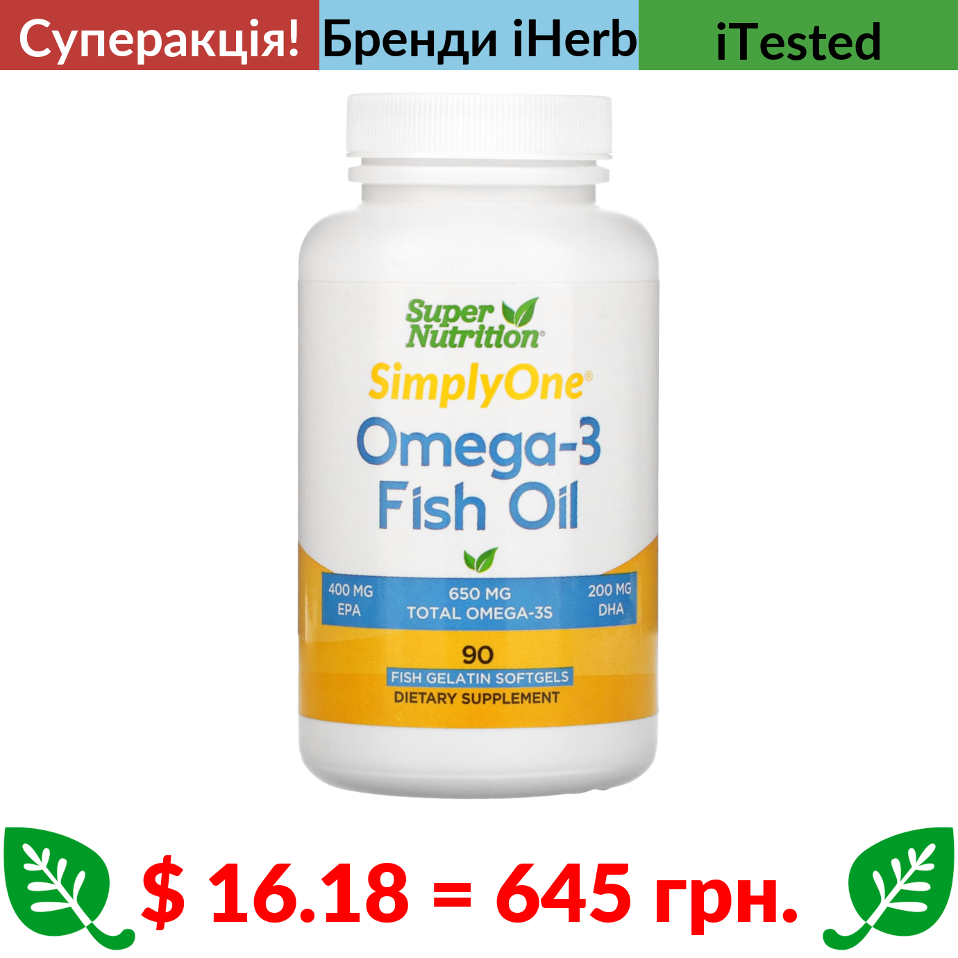 $ 16.18 = 645 грн. ???? cуперакція! ???? Super Nutrition, риб’ячий жир з омега-3, тригліцерид Vivomega, 1000 мг, 90 риб’ячих капсул