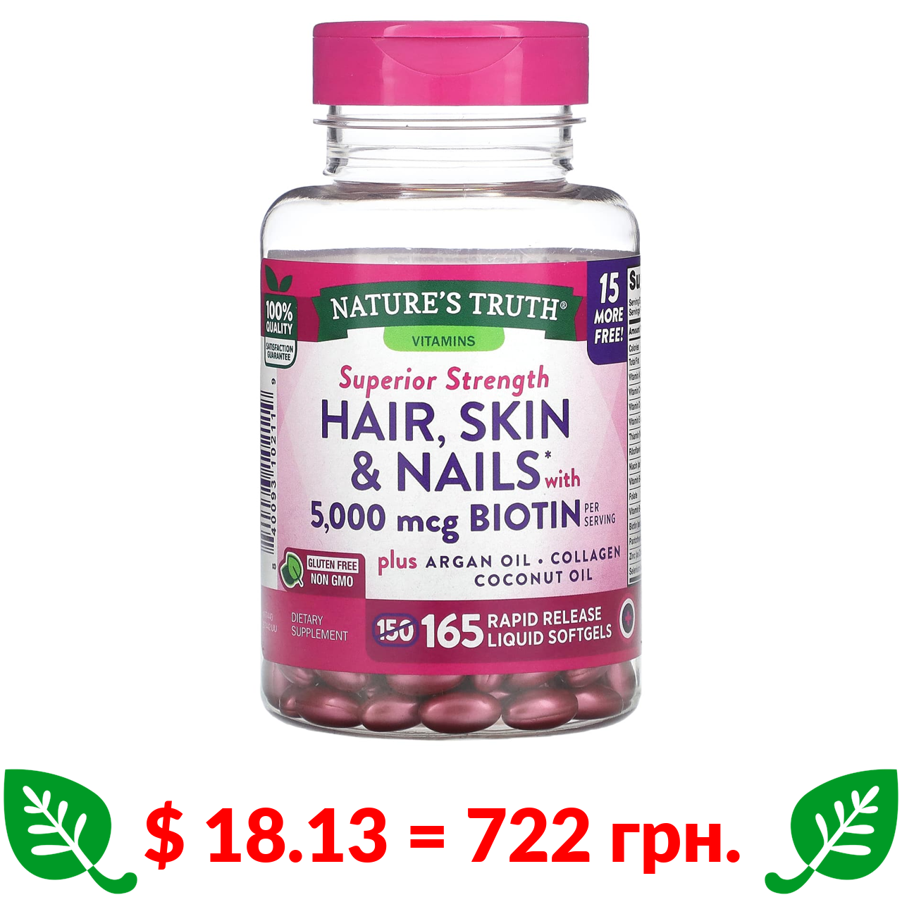 $ 18.13 = 722 грн. Nature’s Truth, добавка з біотином для волосся, шкіри та нігтів, 5000 мкг, 165 капсул із рідиною зі швидким вивільненням