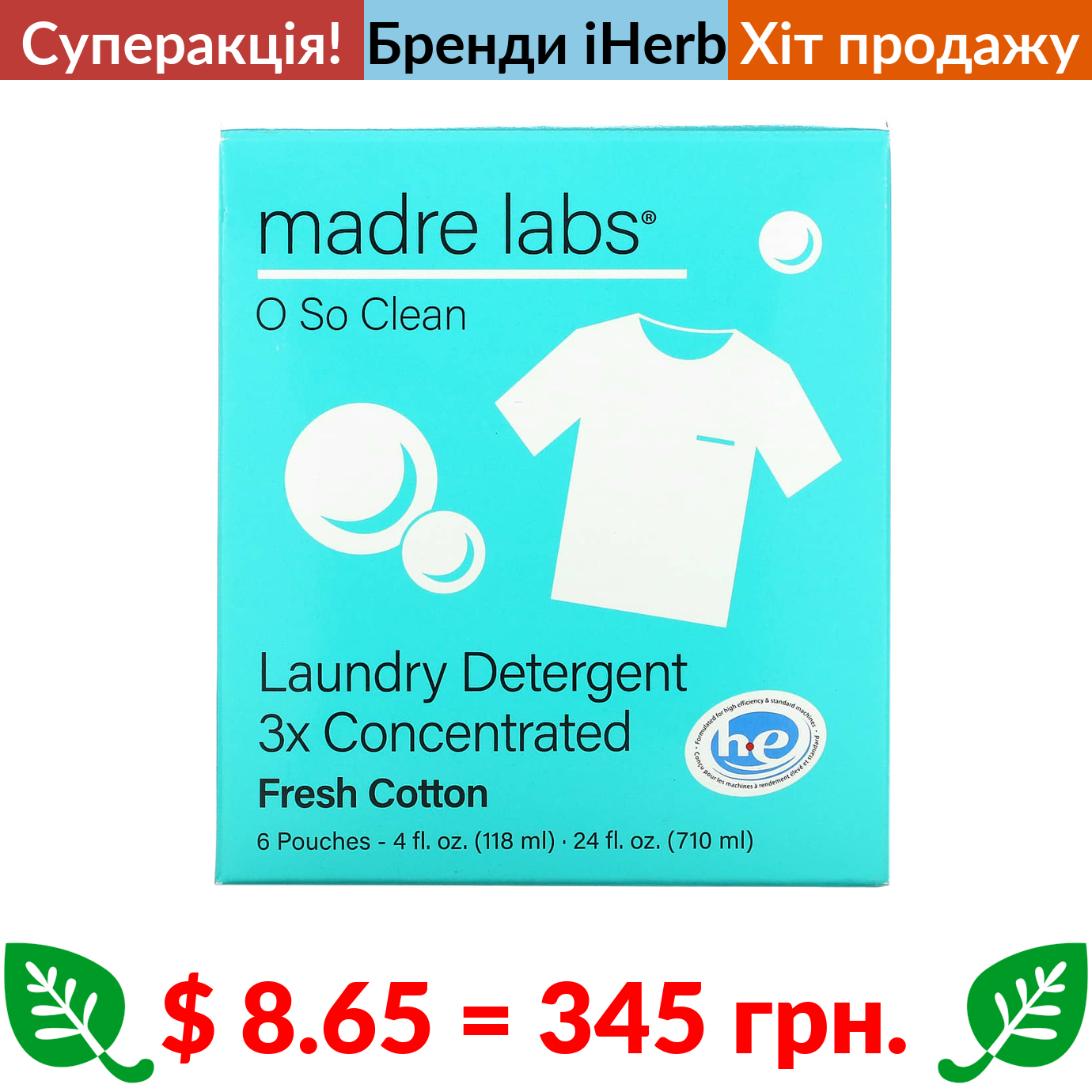 $ 8.65 = 345 грн. ???? cуперакція! ???? Madre Labs, засіб для прання, потрійний концентрат, свіжа бавовна, 6 пакетиків, по 118 мл (4 унції) в кожному