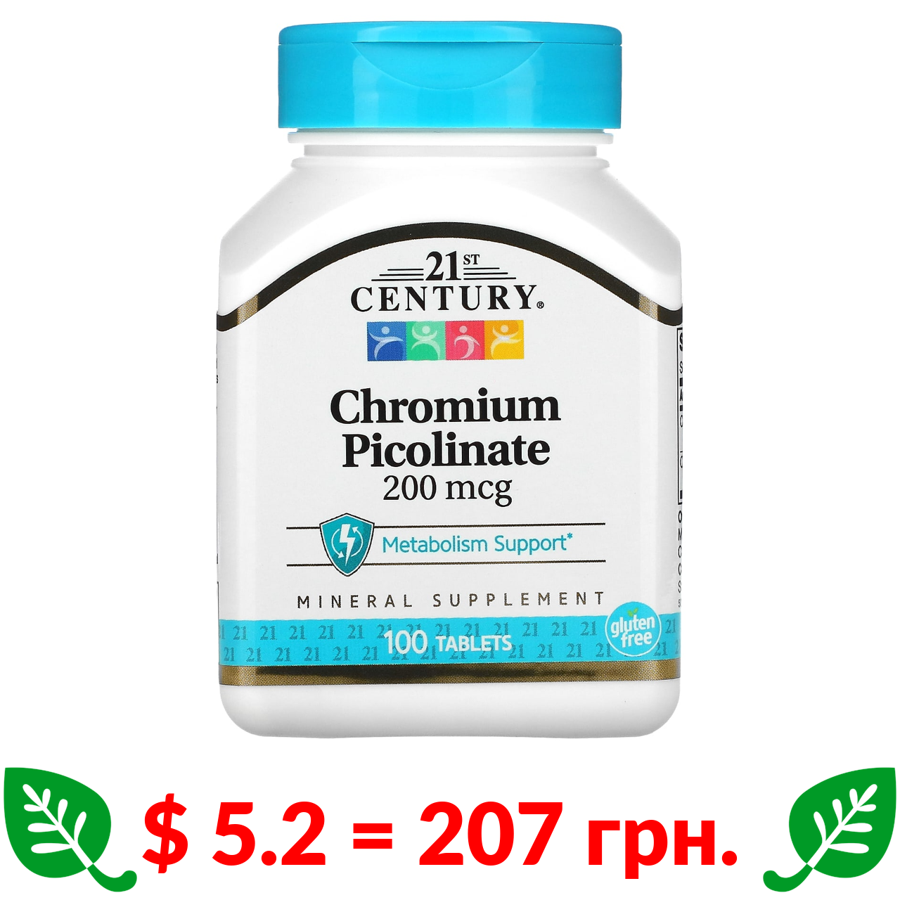 $ 5.2 = 207 грн. 21st Century, піколінат хрому, 200 мкг, 100 таблеток