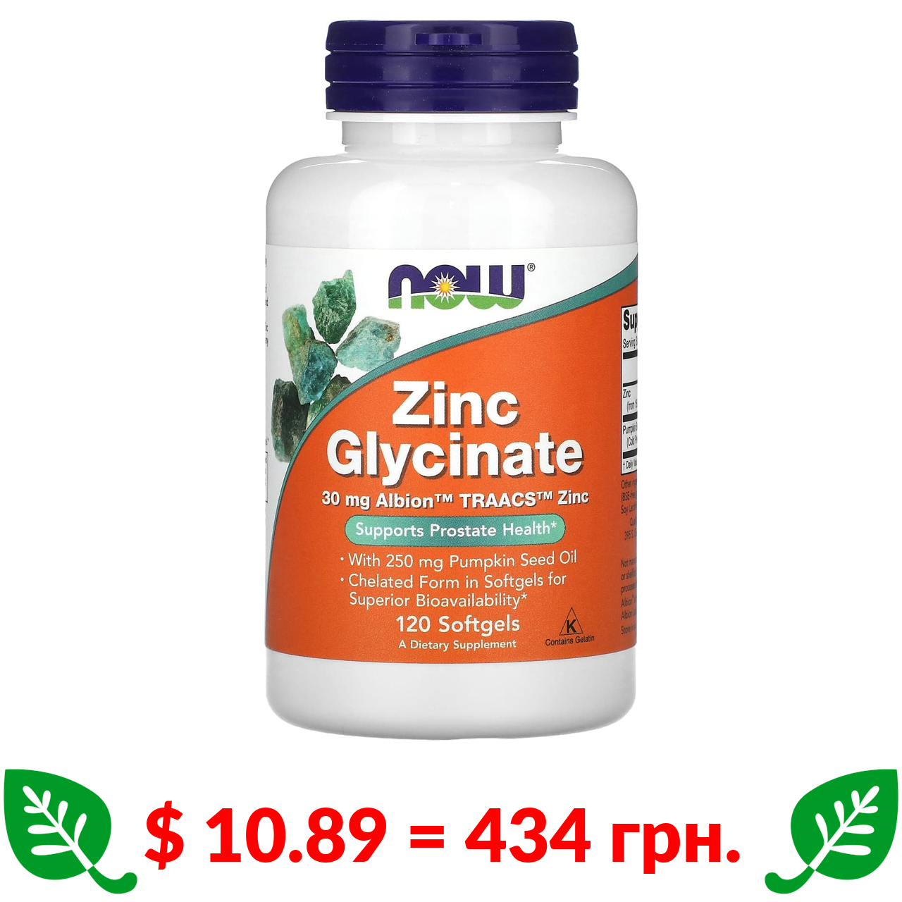 $ 10.89 = 434 грн. Now Foods, гліцинат цинку, 120 капсул