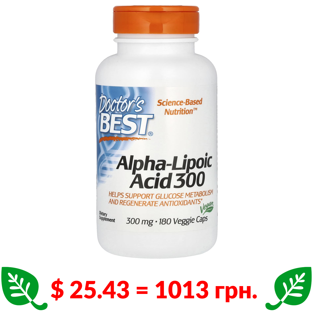 $ 25.43 = 1013 грн. Doctor’s Best, альфа-ліпоєва кислота 300, 300 мг, 180 рослинних капсул