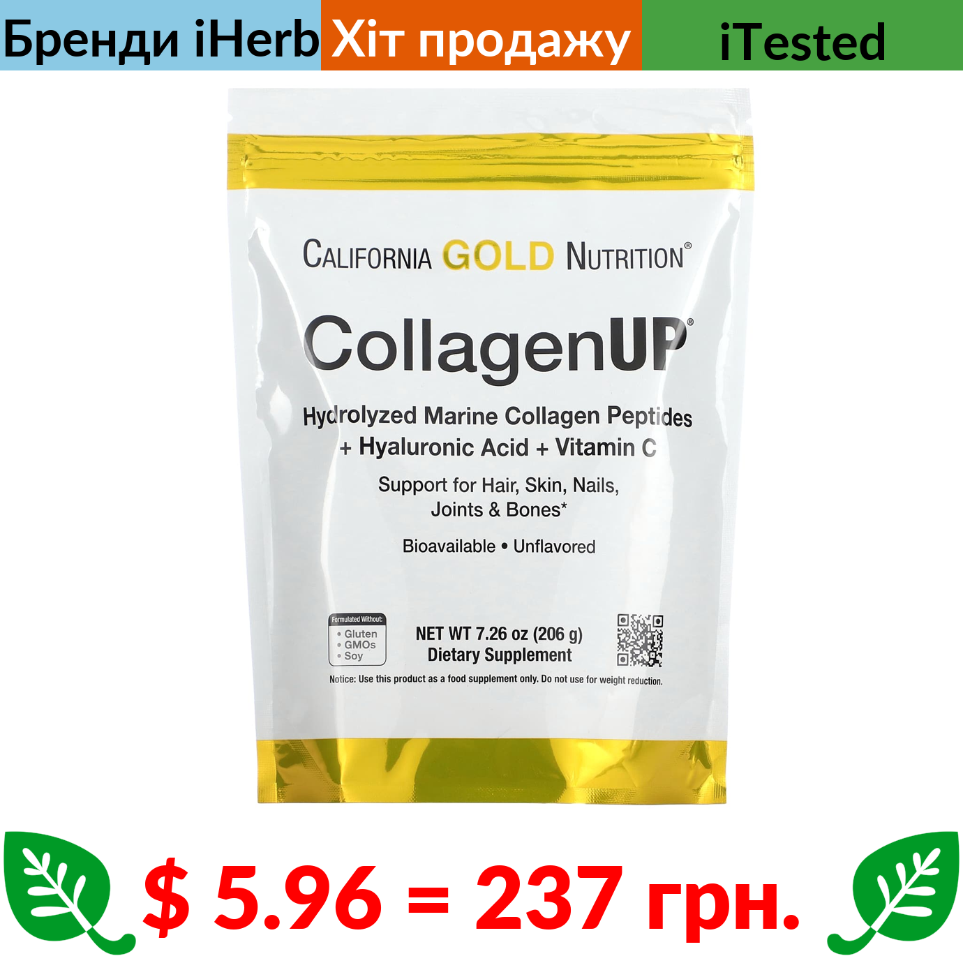 $ 5.96 = 237 грн. ???? cуперакція! ???? California Gold Nutrition, CollagenUP, пептиди гідролізованого морського колагену з гіалуроновою кислотою та вітаміном C, без добавок, 206 г (7,26 фунта)