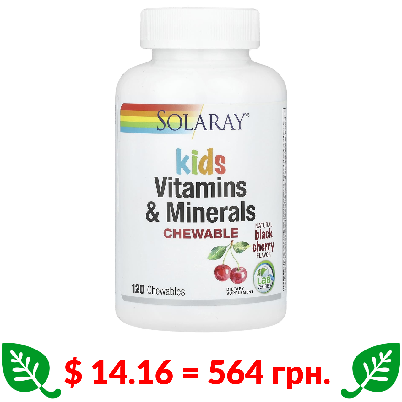 $ 14.16 = 564 грн. Solaray, жувальні вітаміни та мікроелементи для дітей, зі смаком натуральної черешні, 120 жувальних таблеток