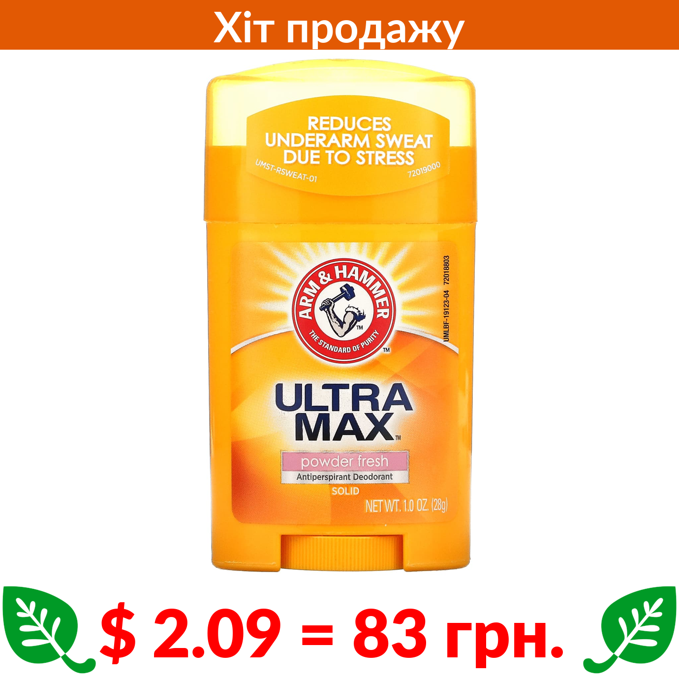 $ 2.09 = 83 грн. Arm & Hammer, UltraMax, твердий дезодорант-антиперспірант для чоловіків, зі свіжим ароматом, 28 г (1 унція)