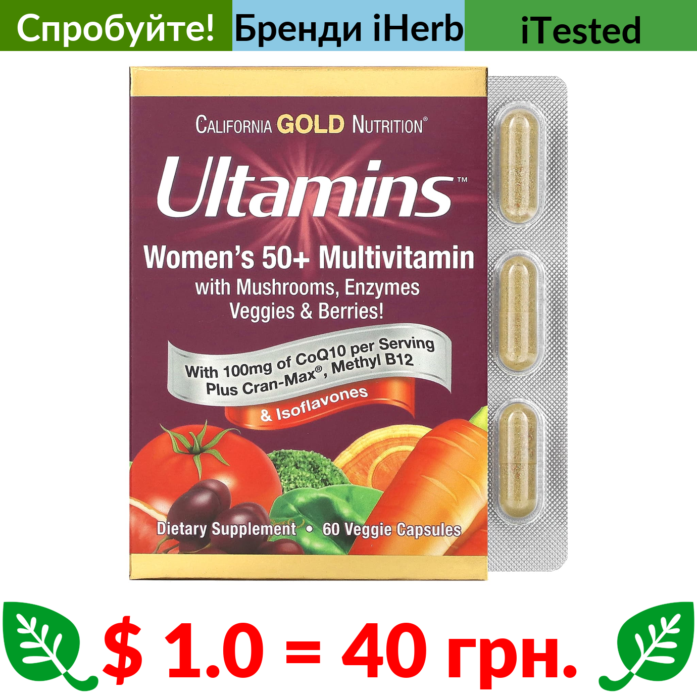 $ 1.0 = 40 грн. ???? варто спробувати ???? California Gold Nutrition, Ultamins, мультивітаміни для жінок старше 50 років із коензимом Q10, гриби, ферменти, овочі та ягоди, 60 вегетаріанських капсул