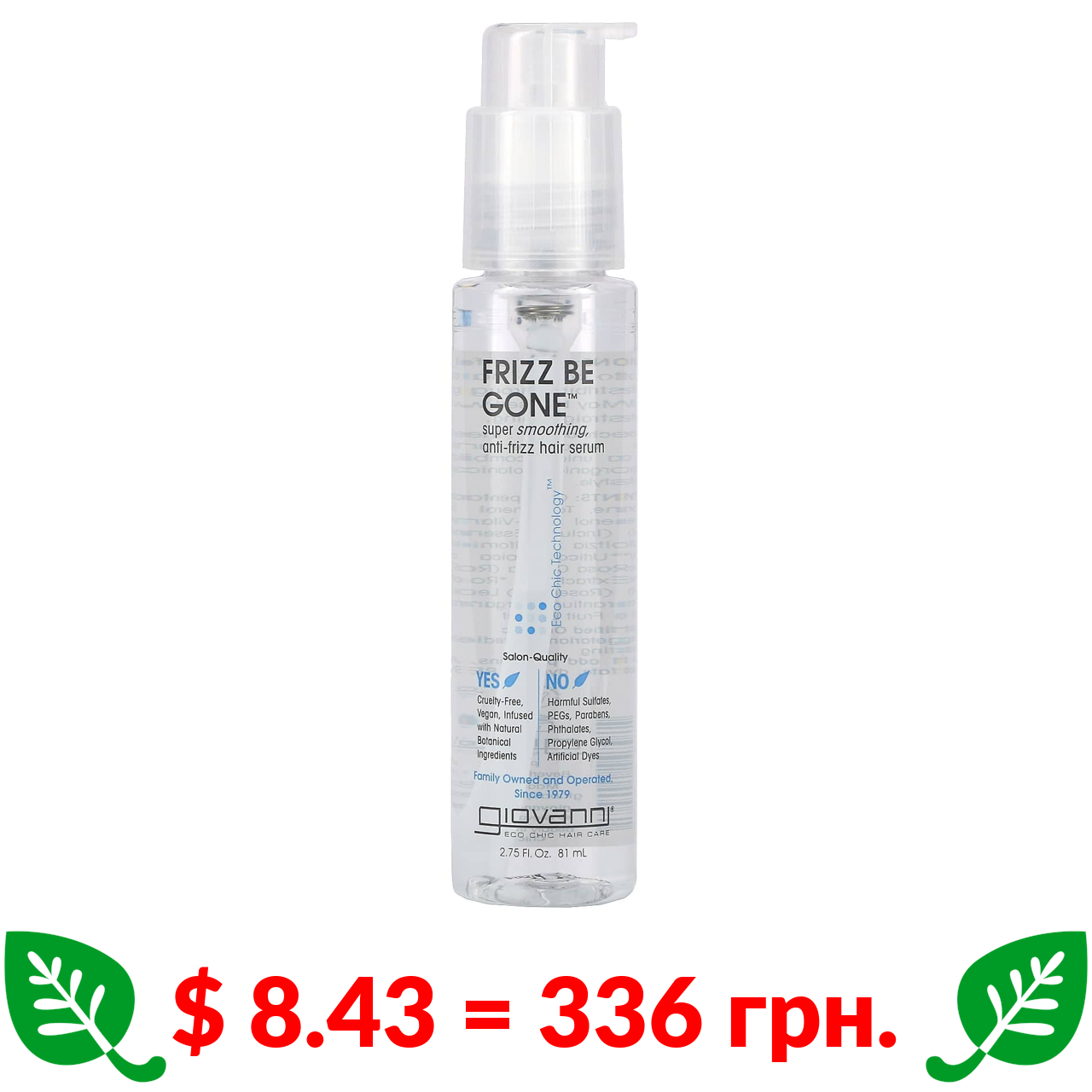 $ 8.43 = 336 грн. ????️ у кошику ????️ Giovanni, Frizz Be Gone, суперрозгладжувальна сироватка проти пушіння волосся, 81 мл (2,75 рідк. унції)