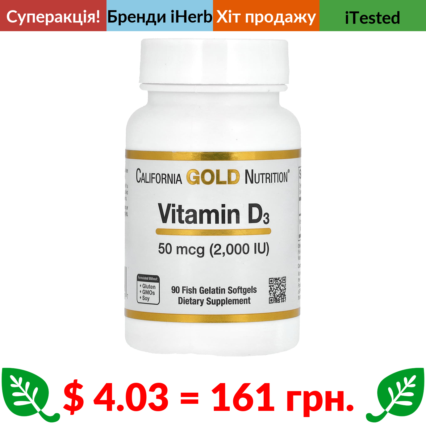 $ 4.03 = 161 грн. ???? cуперакція! ???? California Gold Nutrition, вітамін D3, 50 мг (2000 МО), 90 капсул із риб’ячого желатину