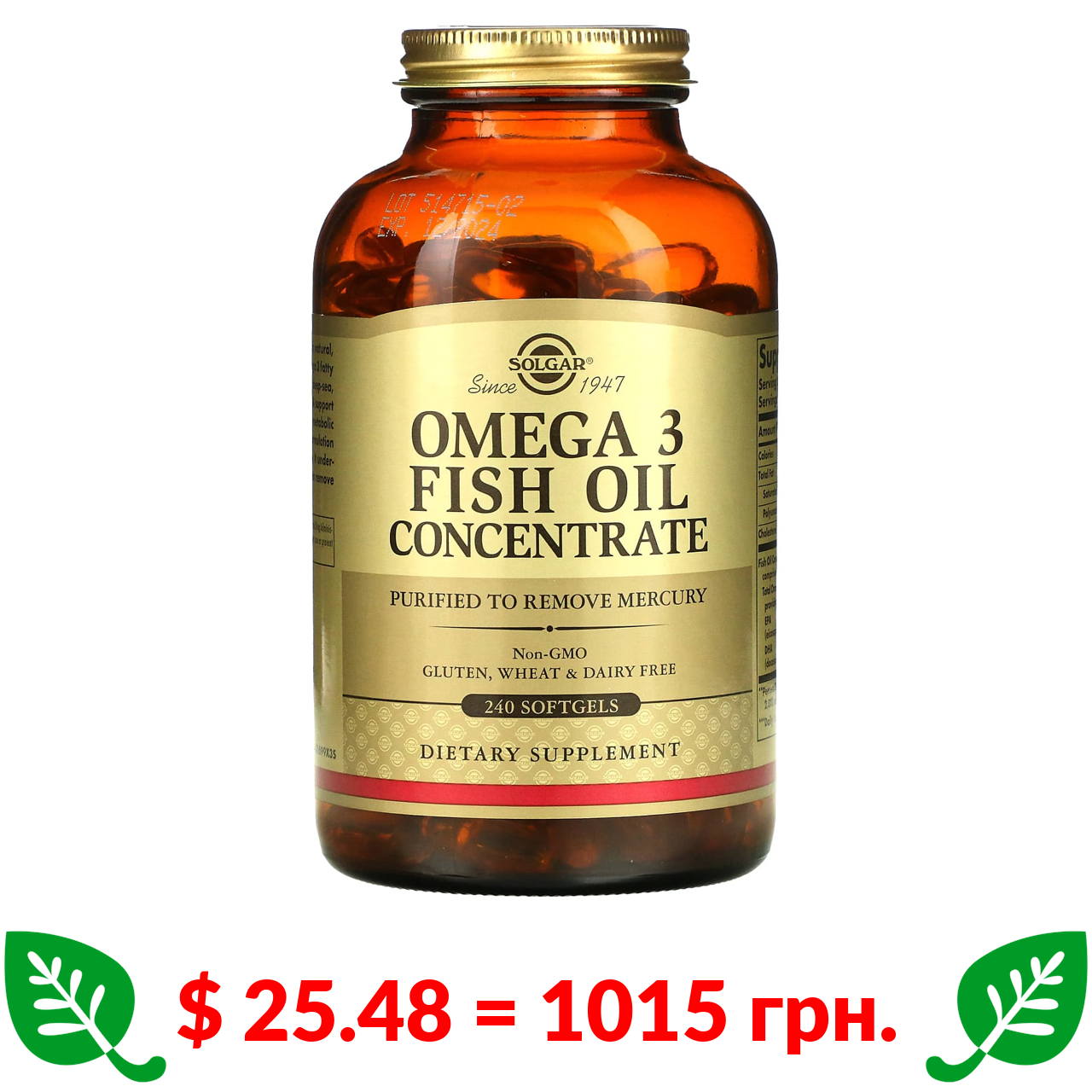 $ 25.48 = 1015 грн. Solgar, концентрат риб’ячого жиру Омега-3, 240 капсул