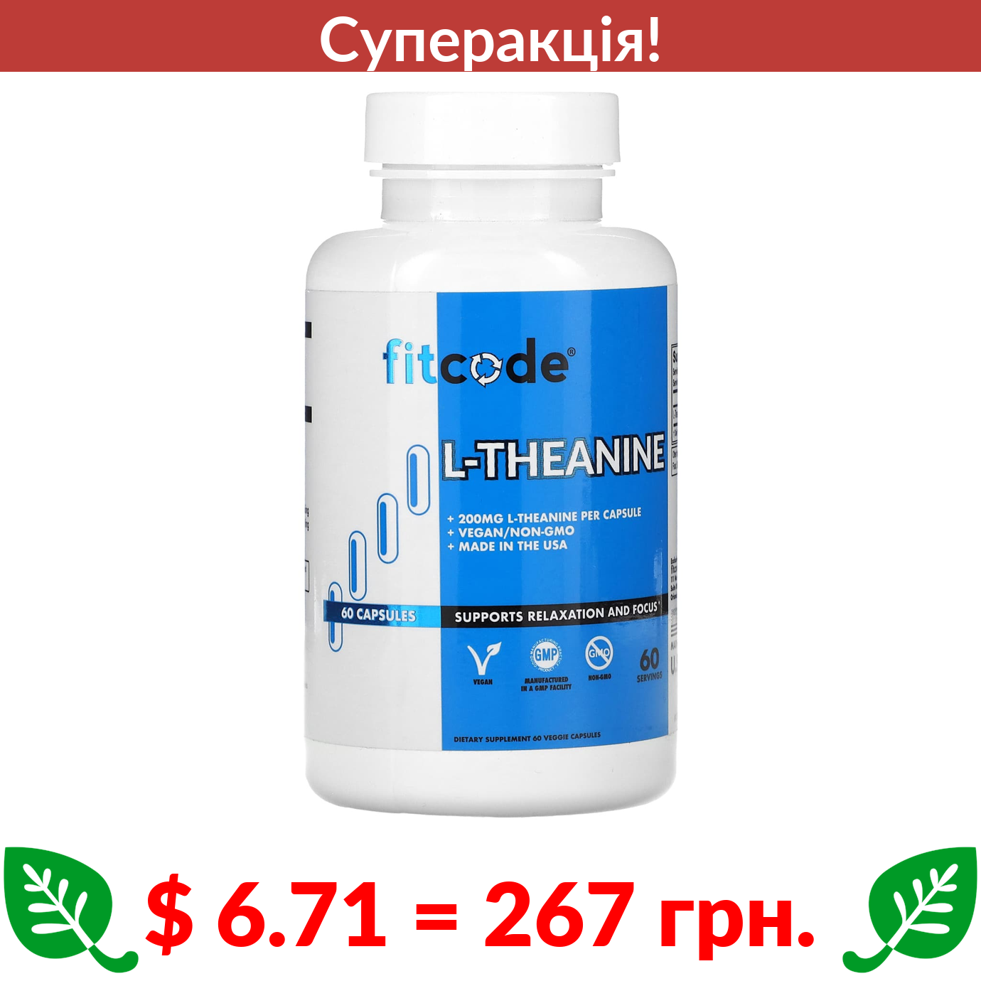 $ 6.71 = 267 грн. ???? cуперакція! ???? FITCODE, L-теанін, 200 мг, 60 веганських капсул