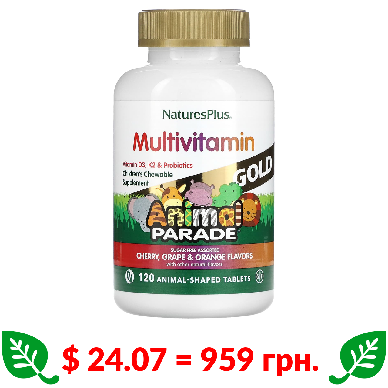 $ 24.07 = 959 грн. Nature’s Plus, Source of Life, Animal Parade Gold, жувальна добавка для дітей з мультивітамінами та мікроелементами, асорті смаків, 120 таблеток у формі тварин