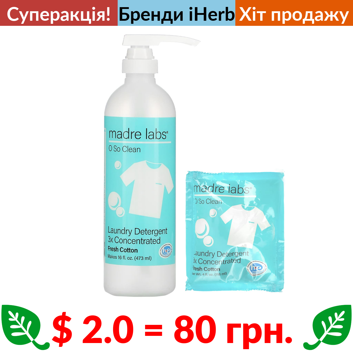 $ 2.0 = 80 грн. ???? cуперакція! ???? Madre Labs, засіб для прання, потрійна концентрація, свіжість бавовни, 1 пакетик і флакон для багаторазового використання, 118 мл (4 рідк. унції)