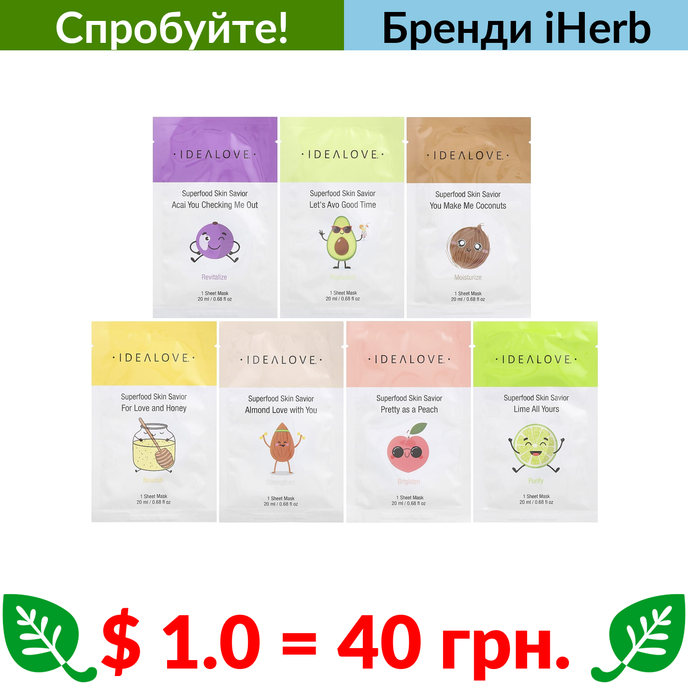 $ 1.0 = 40 грн. ???? варто спробувати ???? Idealove, Superfood Skin Savior, тканинні косметичні маски із суперфудами, асорті, 7 шт. по 20 мл (0,68 рідк. унції)