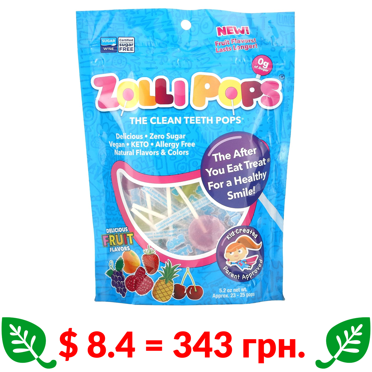 $ 8.4 = 343 грн. Zollipops, The Clean Teeth Pops, льодяники для чищення зубів, полуниця, апельсин, малина, вишня, виноград, ананас, прибл. 23–25 льодяників ZolliPops, 147 г (5,2 унції)