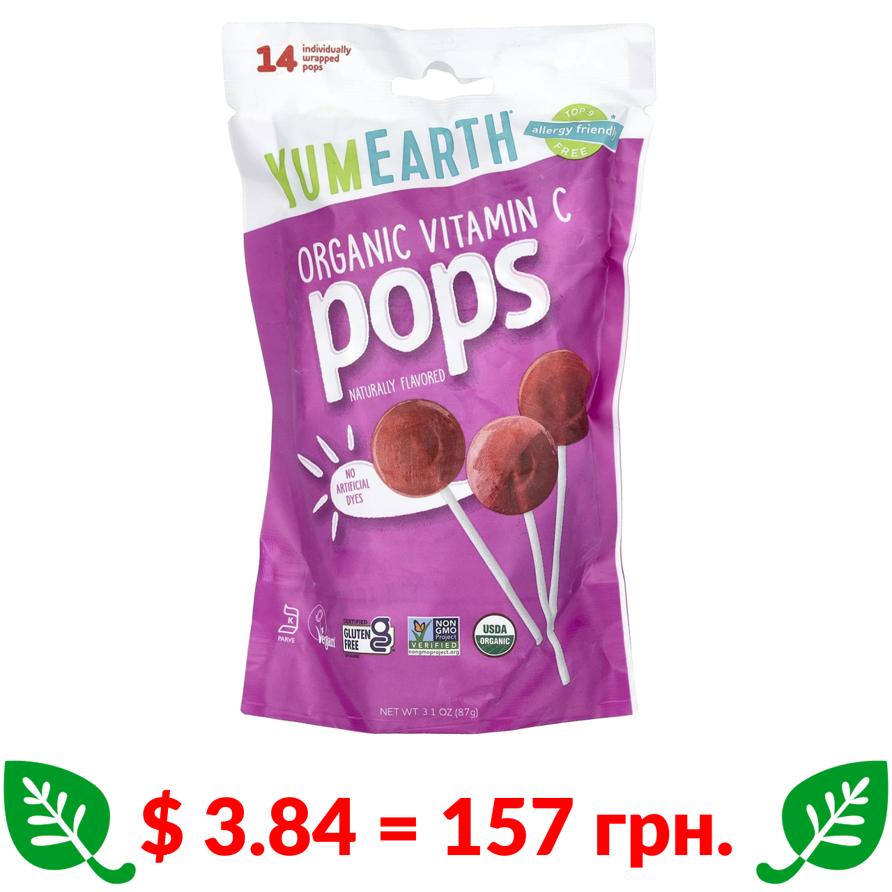 $ 3.84 = 157 грн. ????️ у кошику ????️ YumEarth, органічні льодяники з вітаміном C, асорті, 14 льодяників, 87 г (3,1 унції)
