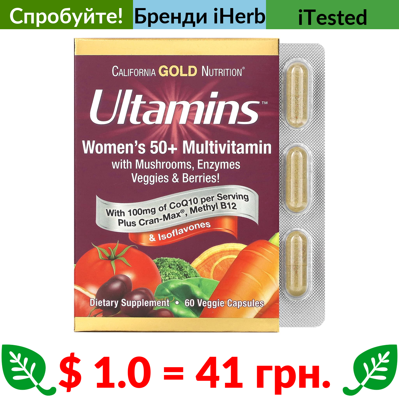$ 1.0 = 41 грн. ???? варто спробувати ???? California Gold Nutrition, Ultamins, мультивітаміни для жінок старше 50 років із коензимом Q10, гриби, ферменти, овочі та ягоди, 60 вегетаріанських капсул