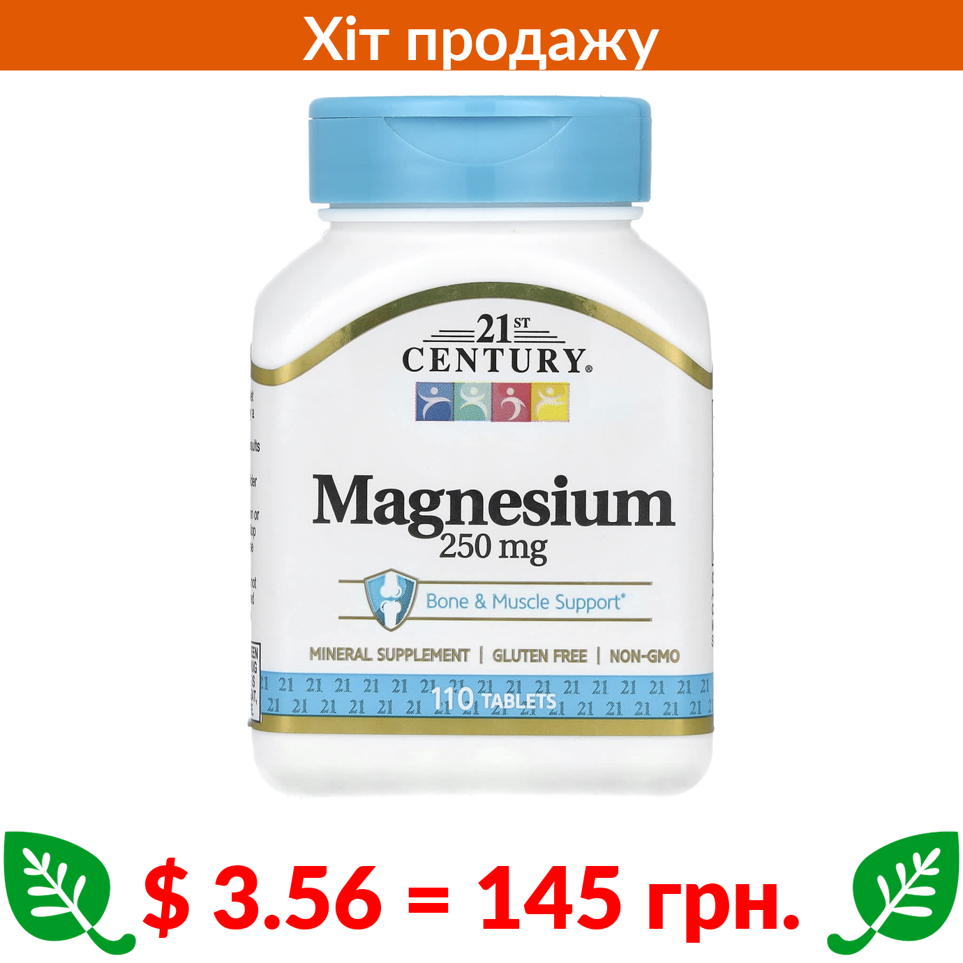 $ 3.56 = 145 грн. 21st Century, магній, 250 мг, 110 таблеток