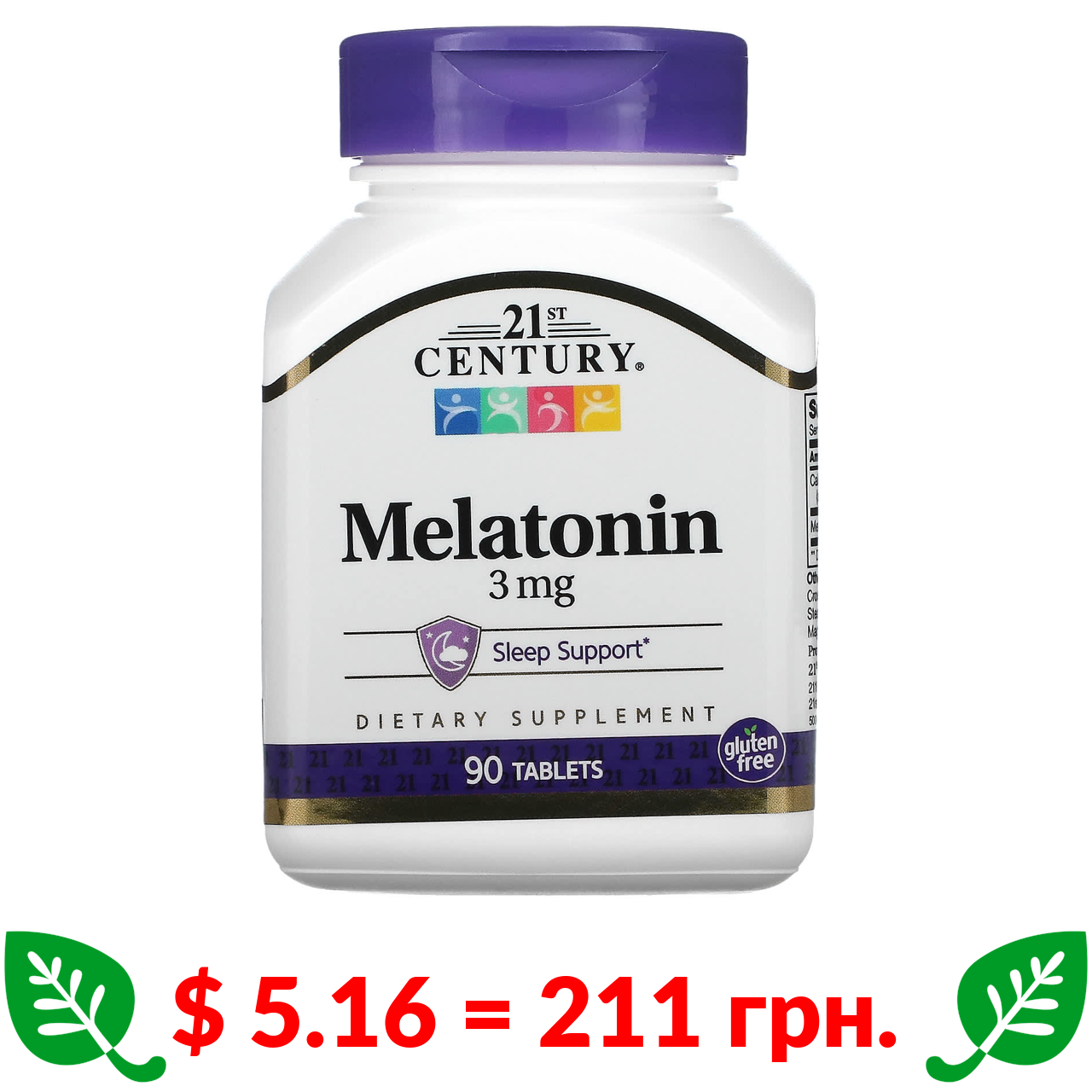 $ 5.16 = 211 грн. 21st Century, мелатонін, 3 мг, 90 таблеток