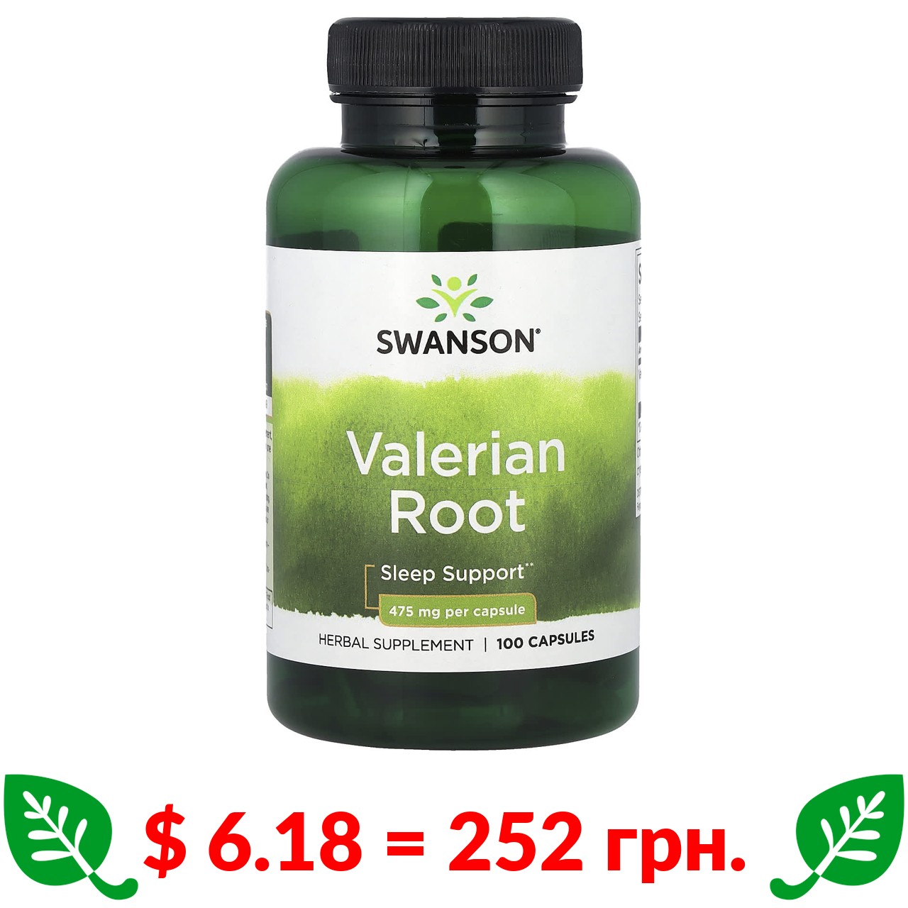 $ 6.18 = 252 грн. Swanson, корінь валеріани, 475 мг, 100 капсул