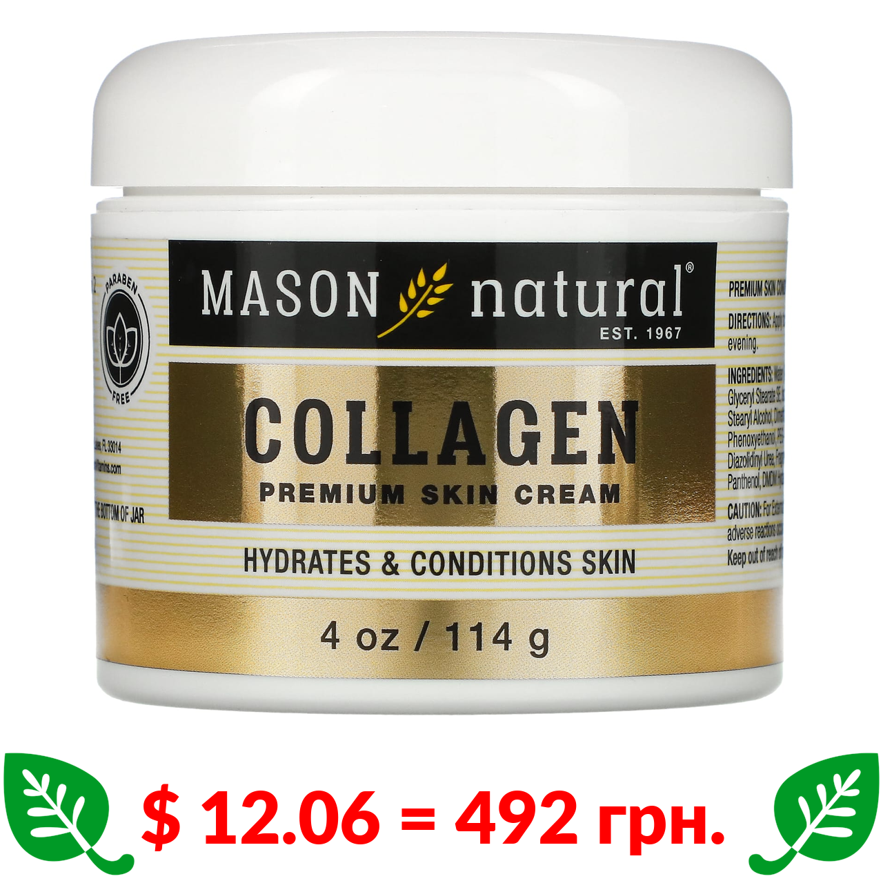 $ 12.06 = 492 грн. ????️ у кошику ????️ Mason Natural, крем для шкіри з колагеном преміальної якості, з запахом груші, 114 г (4 унції)