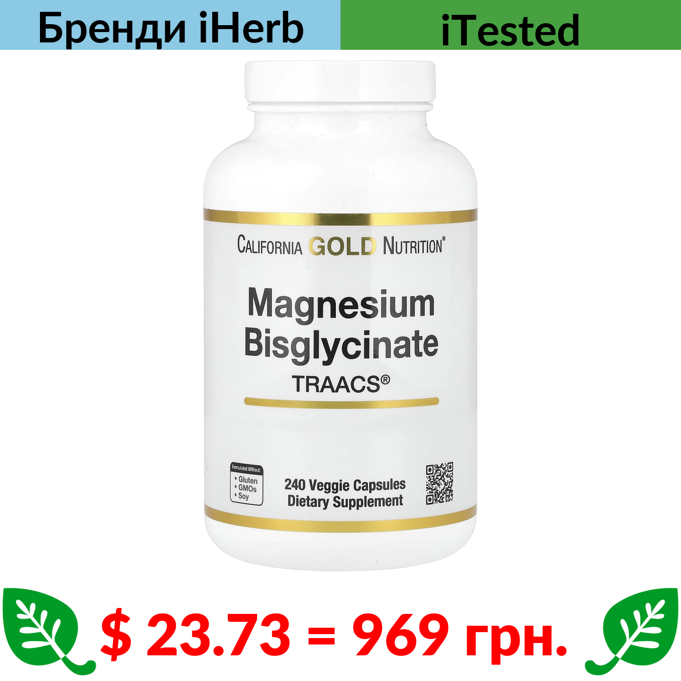 $ 23.73 = 969 грн. ????️ у кошику ????️ California Gold Nutrition, бісгліцинат магнію, з TRAACS, 200 мг, 240 веганських капсул (100 мг у капсулі)