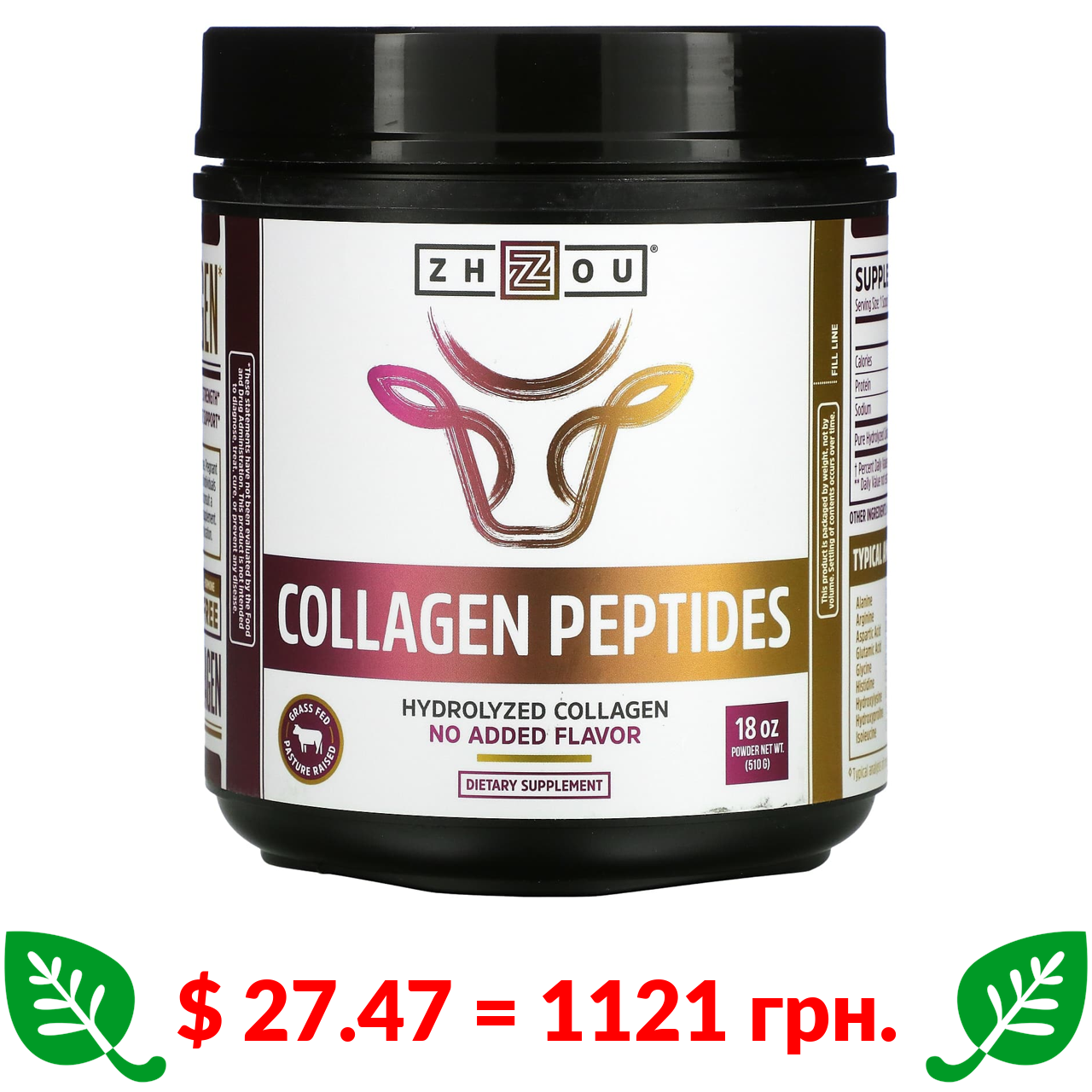 $ 27.47 = 1121 грн. Zhou Nutrition, пептиди колагену, гідролізований колаген, без ароматизаторів, 510 г (18 унцій)