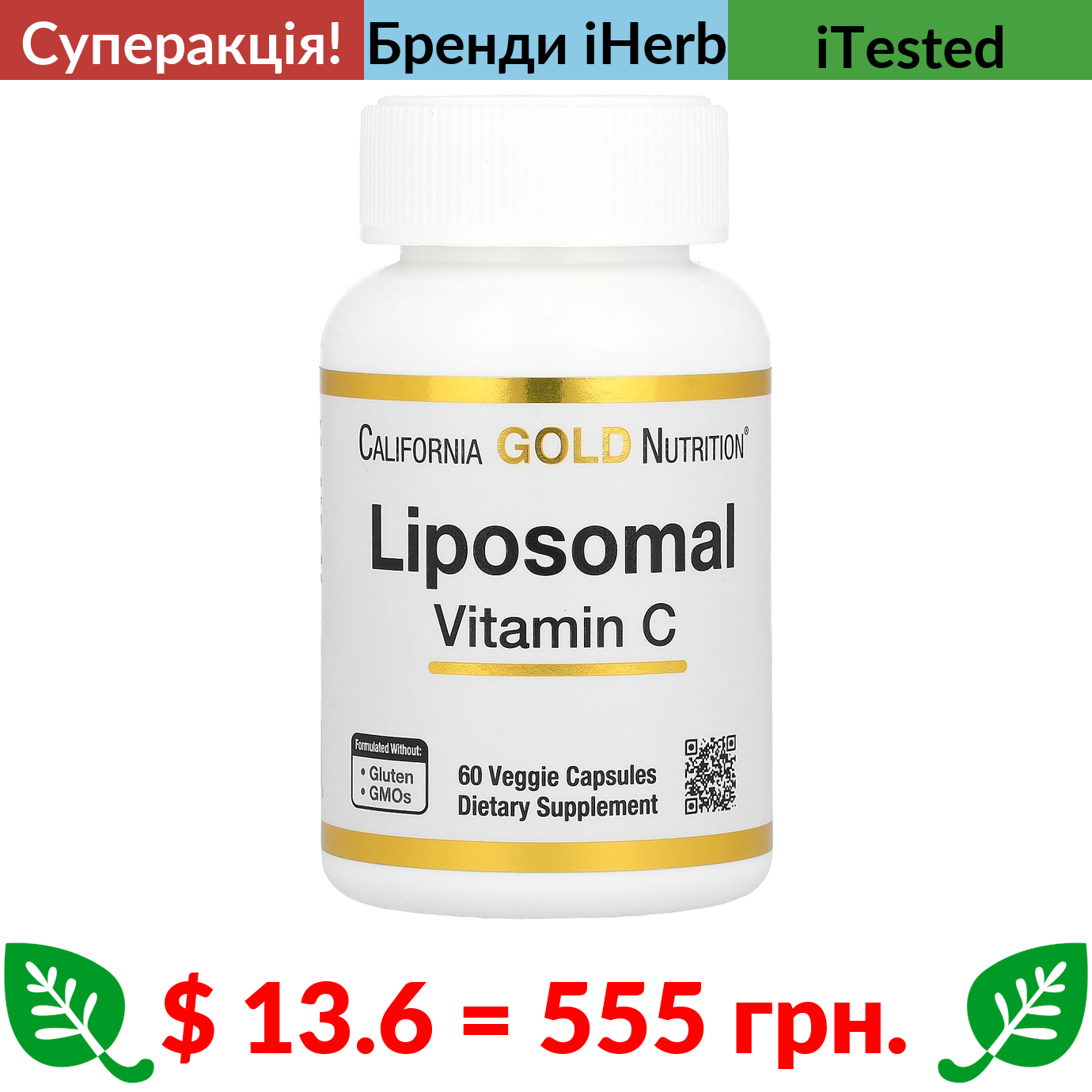 $ 13.6 = 555 грн. ???? cуперакція! ???? California Gold Nutrition, ліпосомальний вітамін C, 500 мг, 60 веганських капсул (250 мг у капсулі)