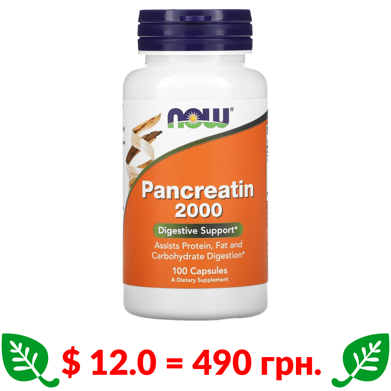 $ 12.0 = 490 грн. Now Foods, панкреатин, 10X — 200 мг, 100 капсул