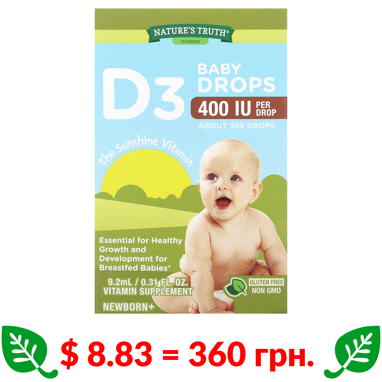 $ 8.83 = 360 грн. Nature’s Truth, вітаміни, вітаміни D3, дитячі краплі, для новонароджених і дітей, 400 МО, 9,2 мл (0,31 рідк. унції)