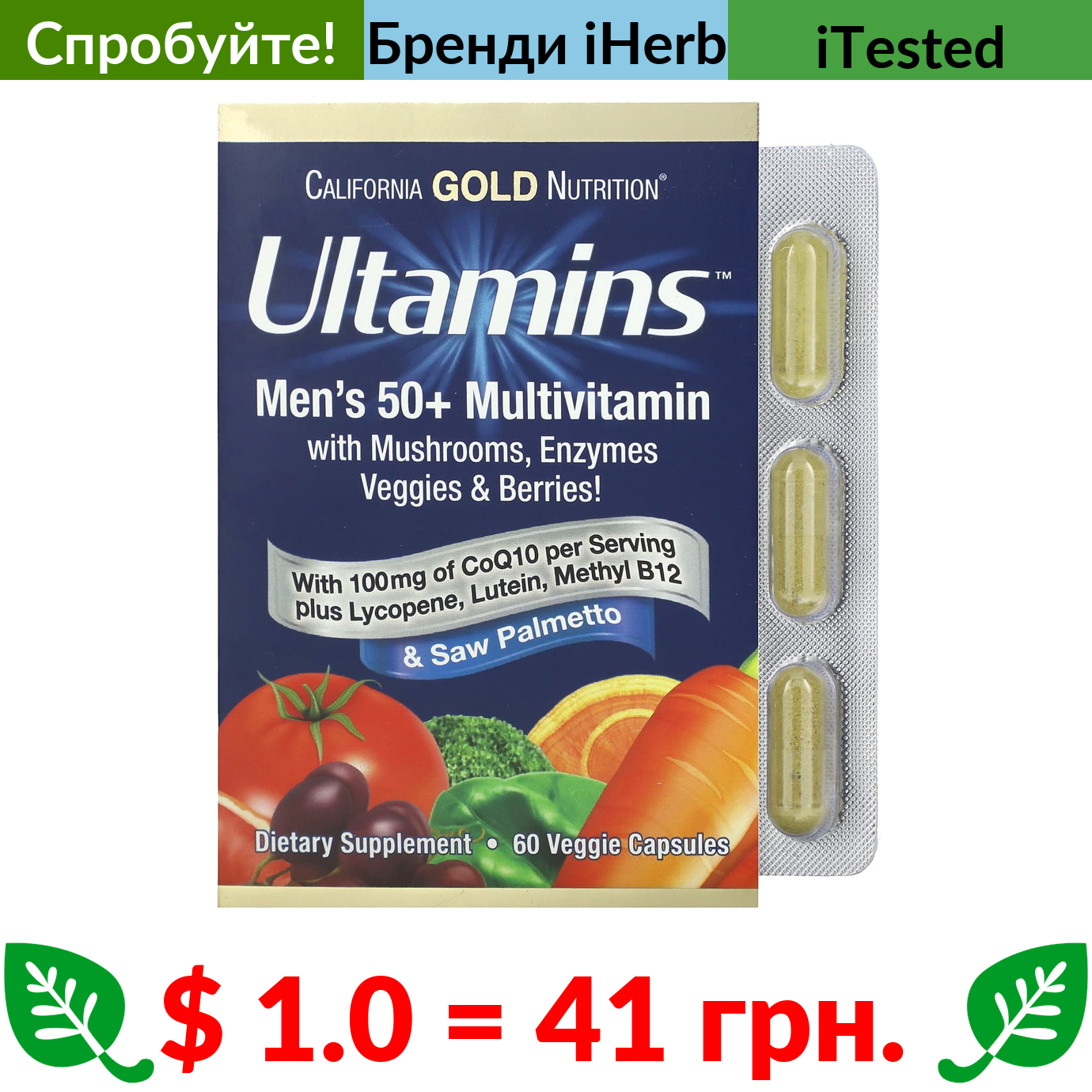 $ 1.0 = 41 грн. ???? варто спробувати ???? California Gold Nutrition, Ultamins, мультивітаміни для чоловіків старше 50 років, з коензимом Q10, грибами, ферментами, овочами та ягодами, 60 рослинних капсул