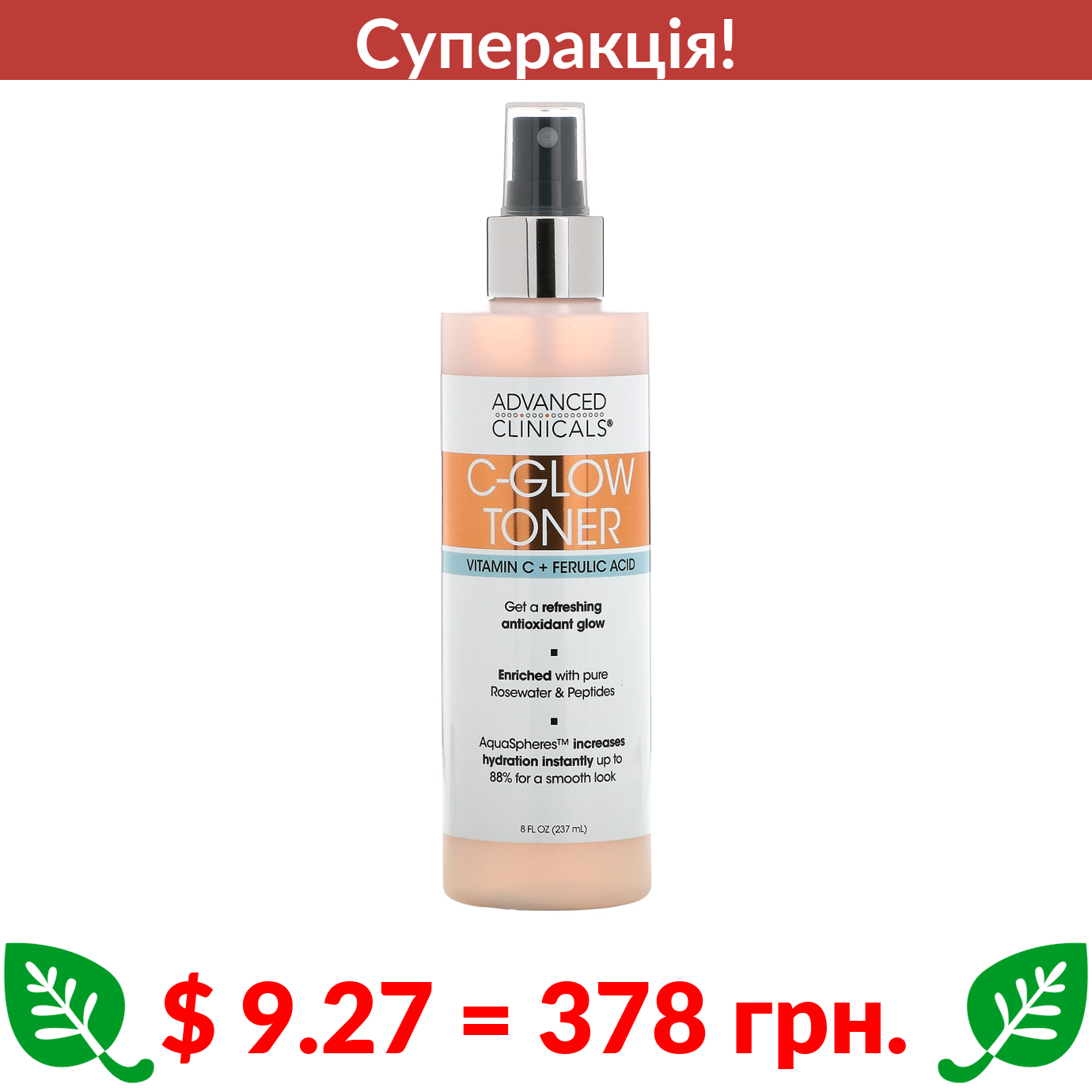 $ 9.27 = 378 грн. ???? cуперакція! ???? Advanced Clinicals, C-Glow, тонік із вітаміном C й феруловою кислотою, 237 мл (8 рідк. унцій)