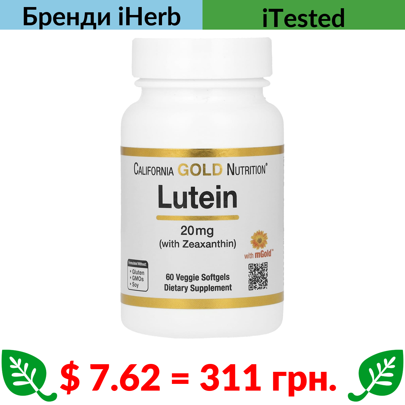 $ 7.62 = 311 грн. ????️ у кошику ????️ California Gold Nutrition, лютеїн із зеаксантином, 20 мг, 60 вегетаріанських капсул