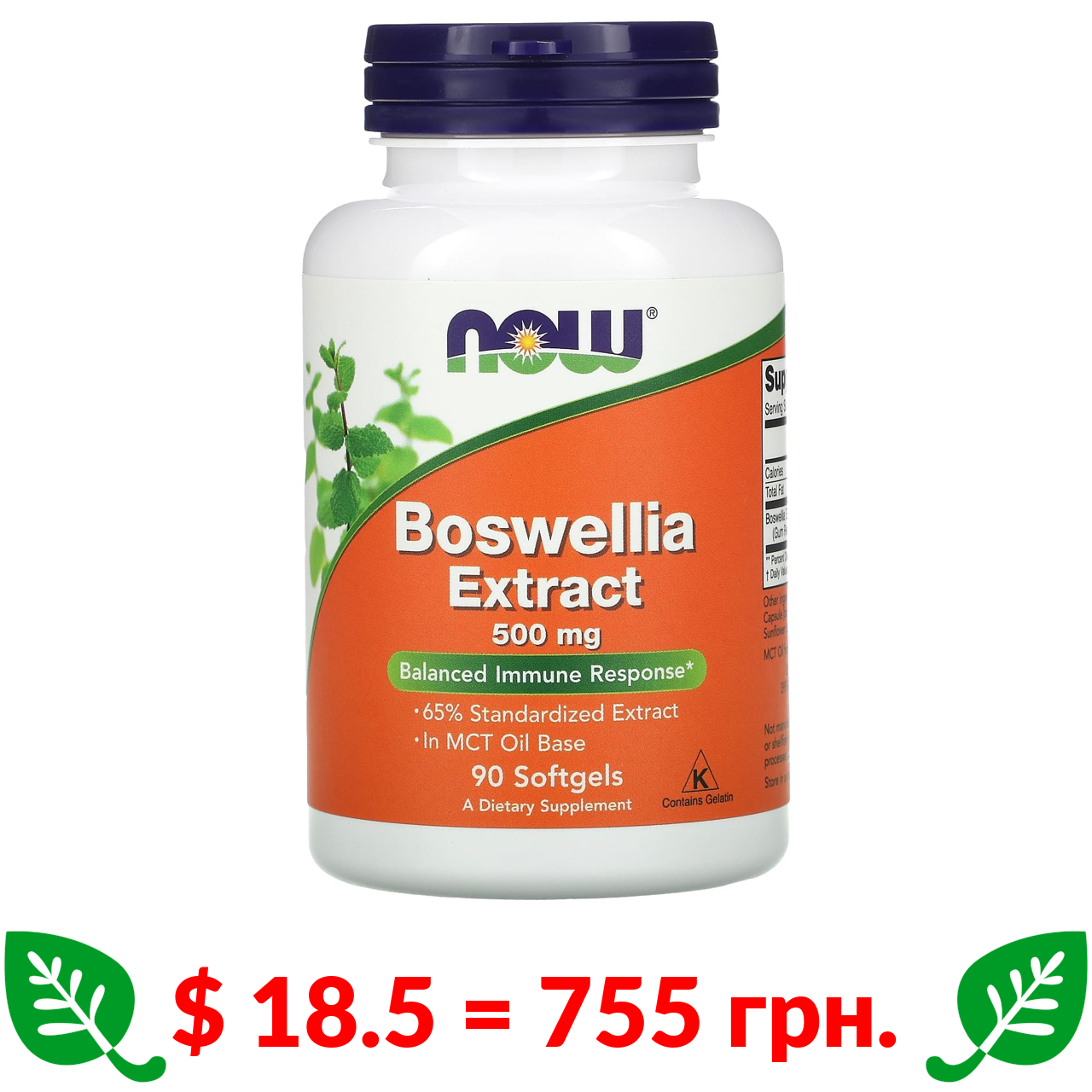 $ 18.5 = 755 грн. Now Foods, екстракт босвелії, 500 мг, 90 капсул