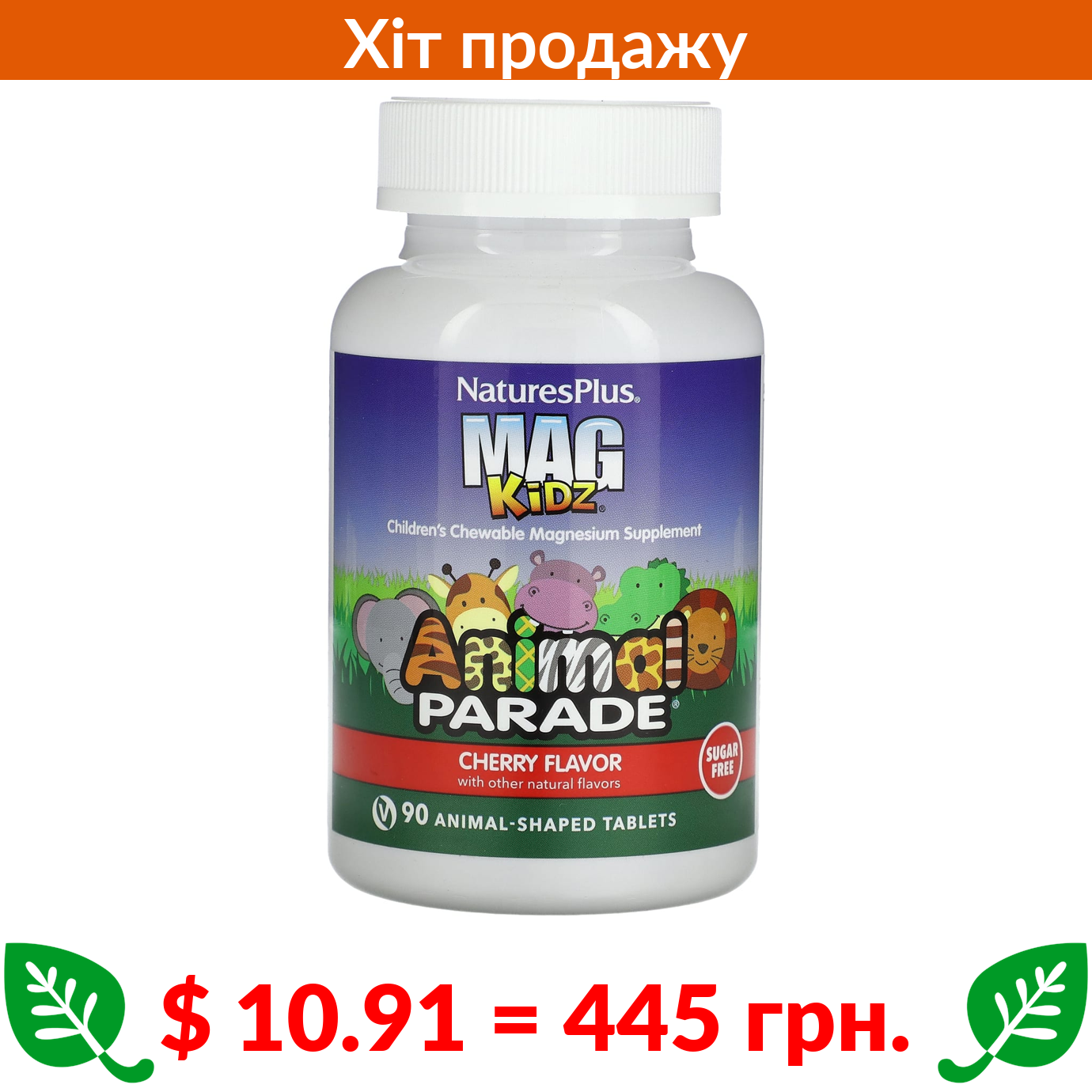 $ 10.91 = 445 грн. Nature’s Plus, MagKidz, Animal Parade, жувальні таблетки з магнієм для дітей, вишня, 90 таблеток у формі тварин