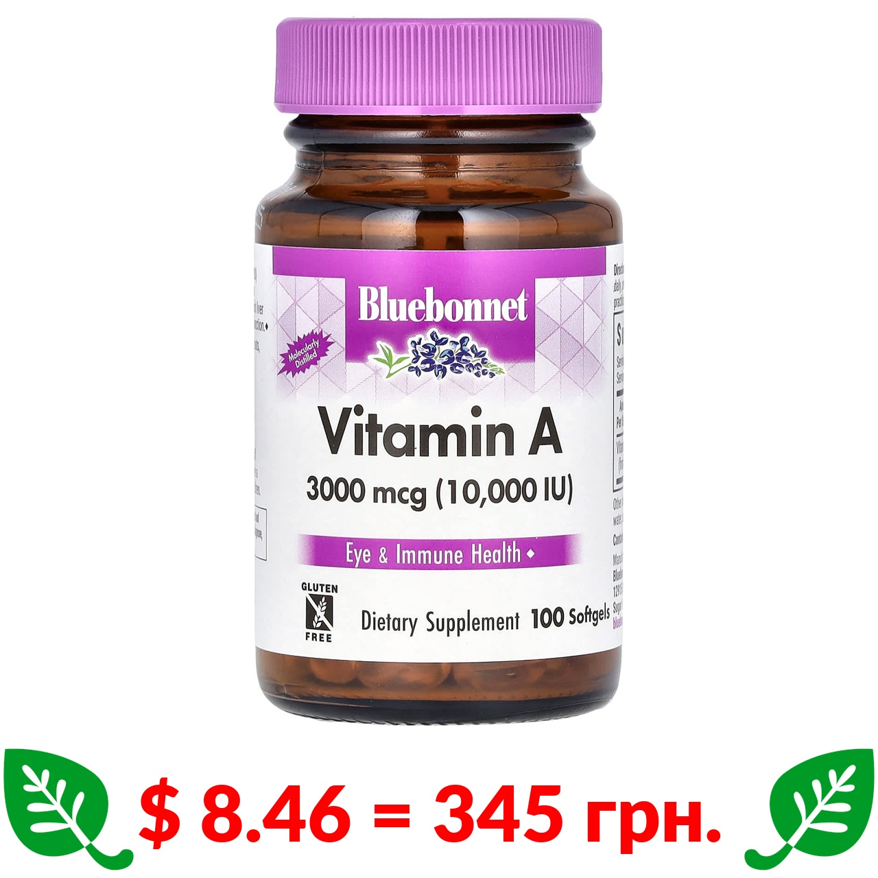 $ 8.46 = 345 грн. Bluebonnet Nutrition, вітамін A, 3000 мкг, 100 капсул