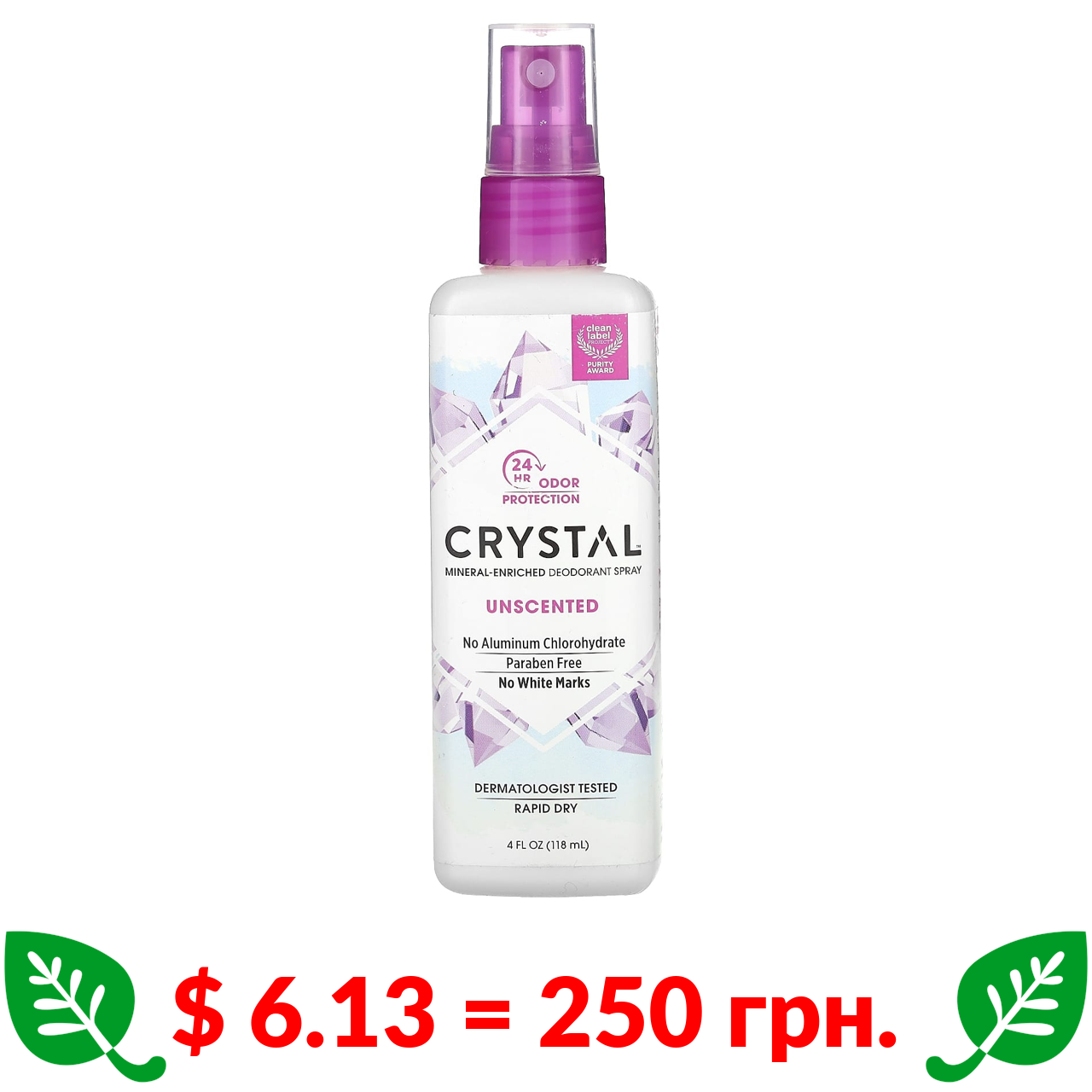 $ 6.13 = 250 грн. Crystal Body Deodorant, мініральний спрей-дезодорант, без запаху, 118 мл (4 рідк. унції)