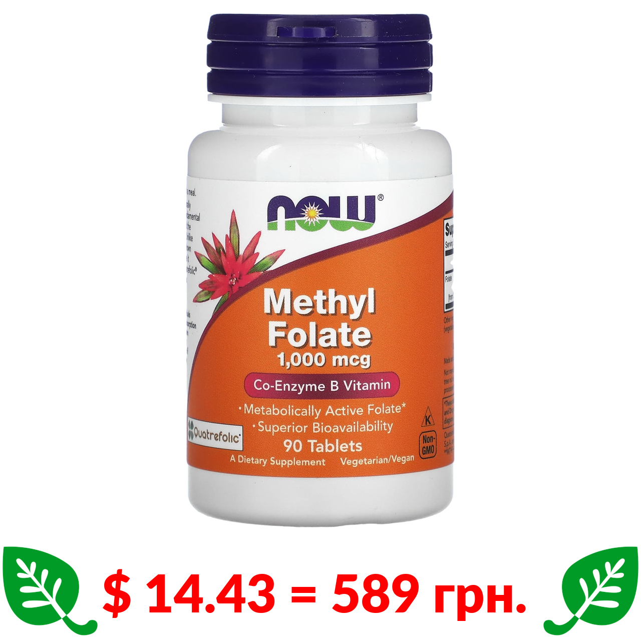 $ 14.43 = 589 грн. Now Foods, метилфолат, 1000 мкг, 90 таблеток
