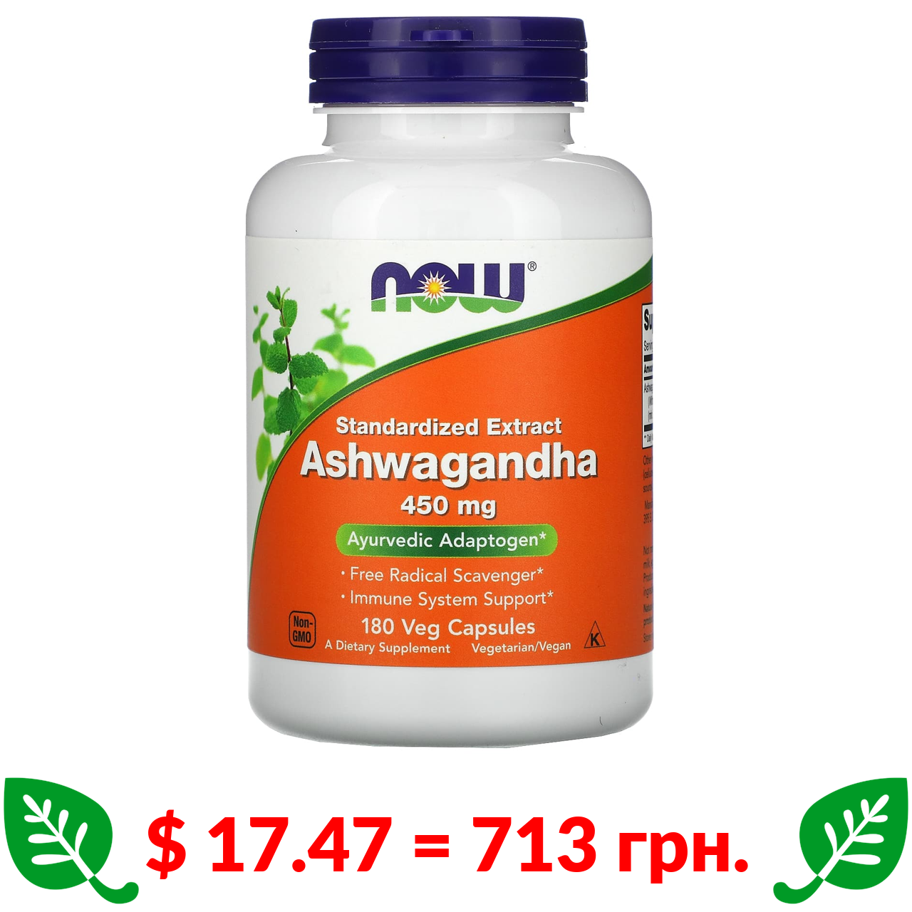 $ 17.47 = 713 грн. Now Foods, стандартизований екстракт ашваганди, 450 мг, 180 вегетаріанських капсул