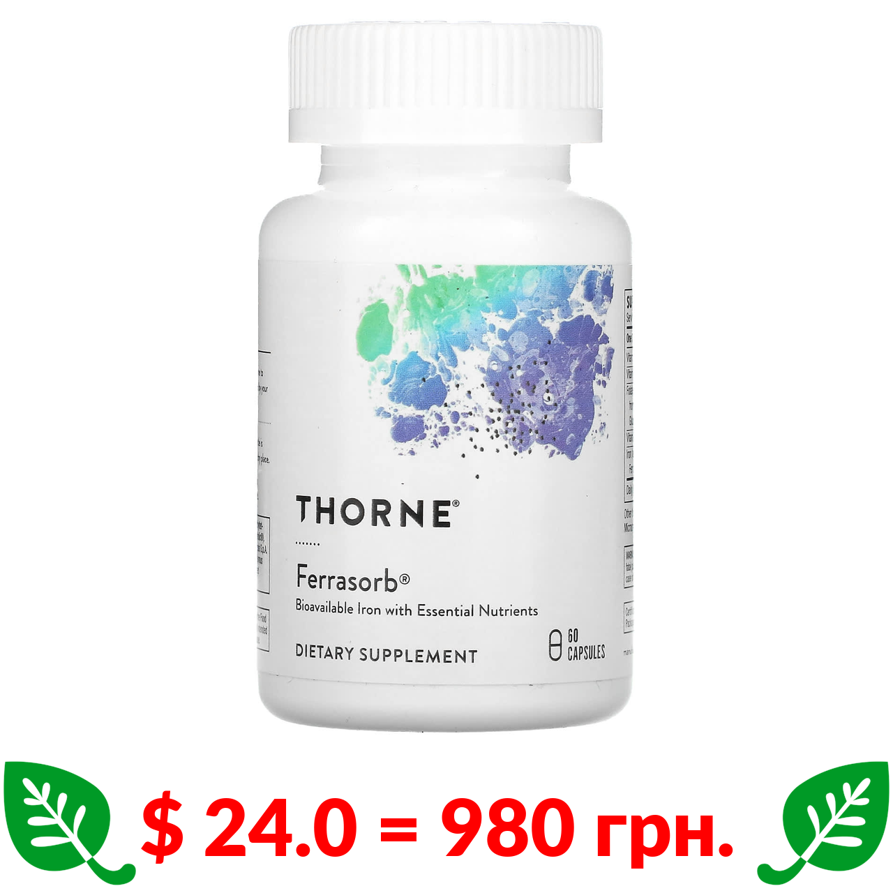 $ 24.0 = 980 грн. Thorne, Ferrasorb, залізо з кофакторами, 60 капсул