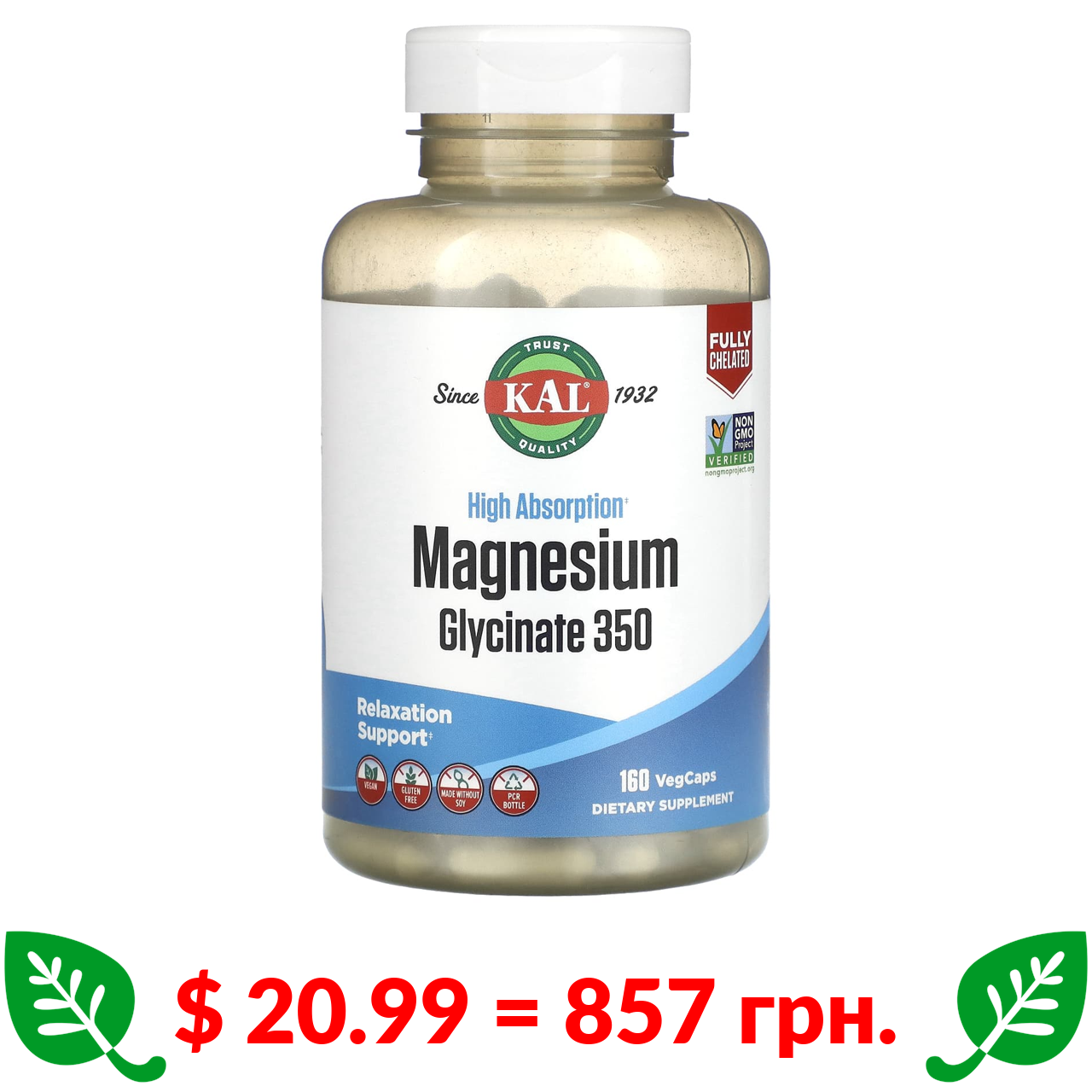 $ 20.99 = 857 грн. KAL, гліцинат магнію з високою абсорбцією, 350 мг, 160 капсул VegCap