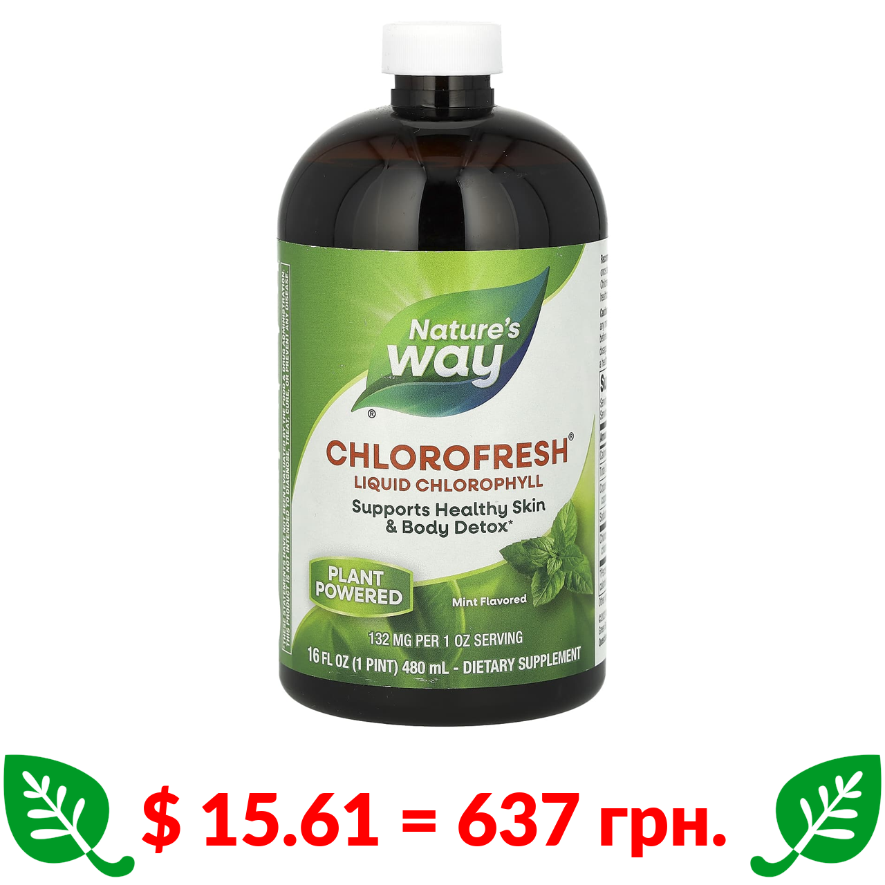 $ 15.61 = 637 грн. Nature’s Way, Chlorofresh, рідкий хлорофіл, зі смаком м’яти, 132 мг, 480 мл (16 рідк. унцій) (132 мг у 2 ст. л.)